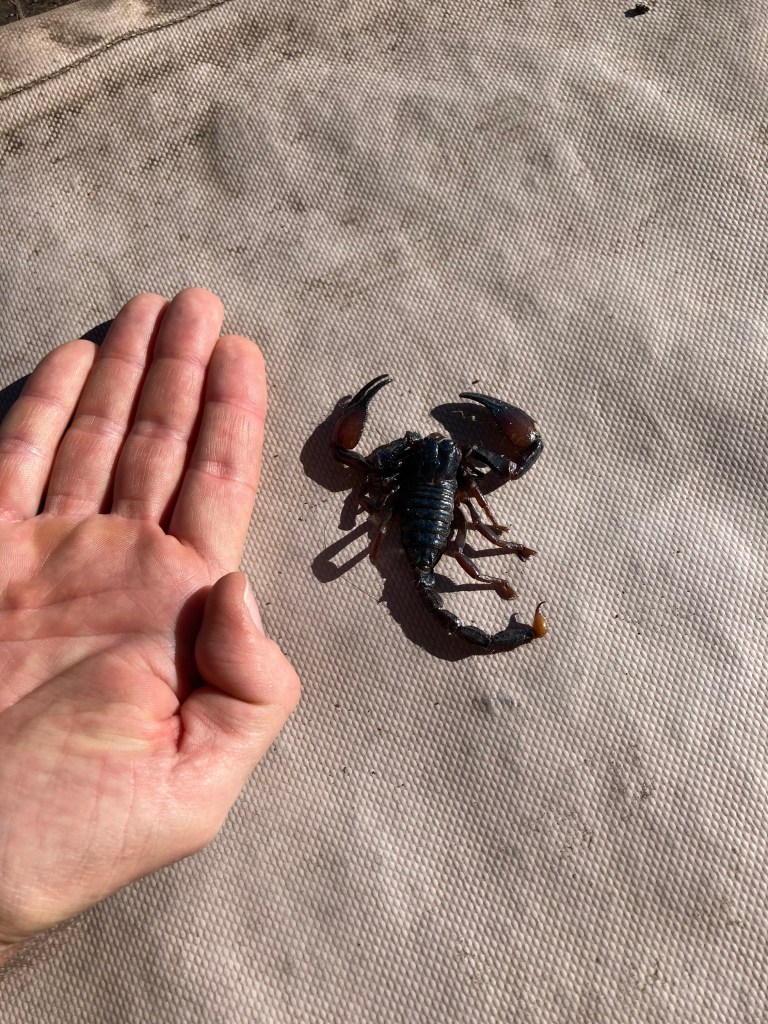 Hier soir, en allant nous coucher nous avons trouvé un gros scorpion dans notre chambre. Nous l’avons attaqué chacun une chaussure à la main. Ce matin, nous l’avons photographié car il était impressionnant tout de même.