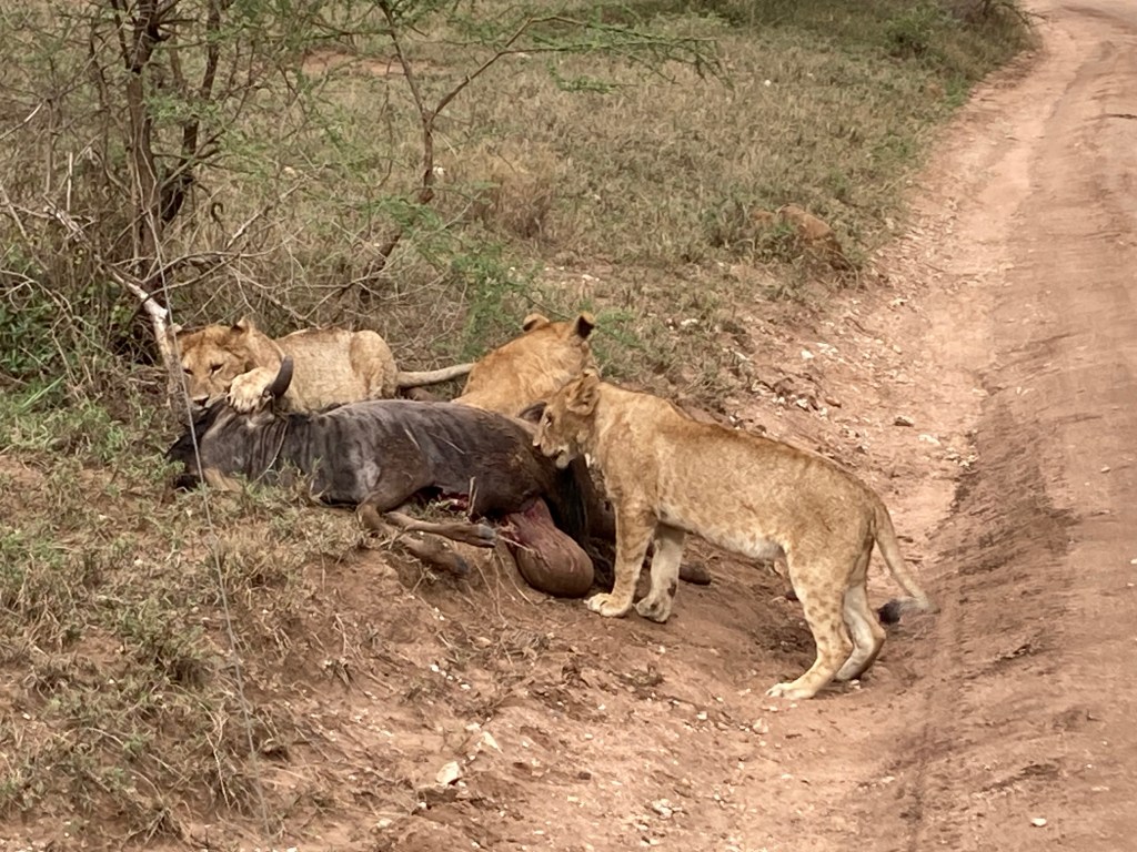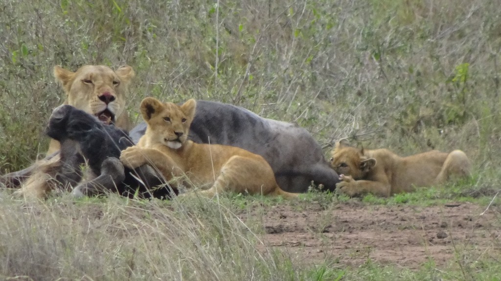 Nous avons vu une lionne avec sa proie qui a rapidement été rejointe par une autre lionne accompagnée de lionceaux.