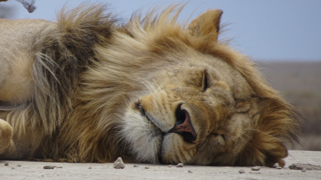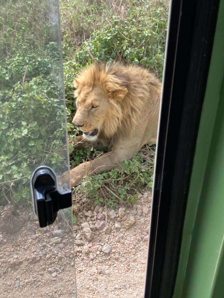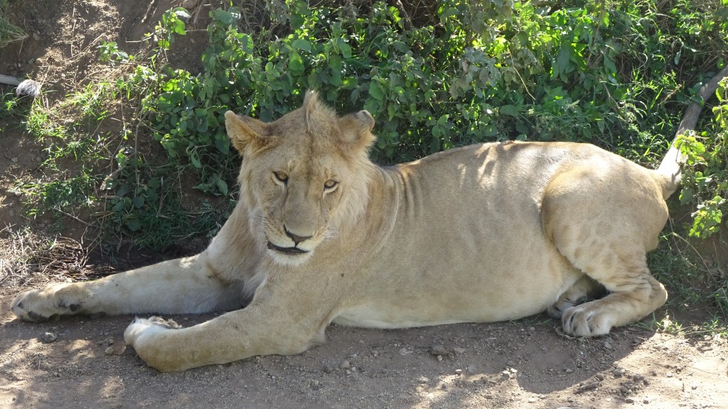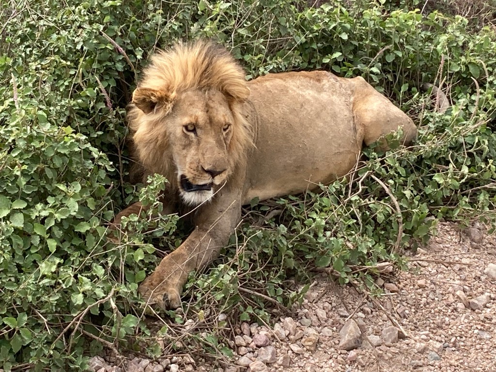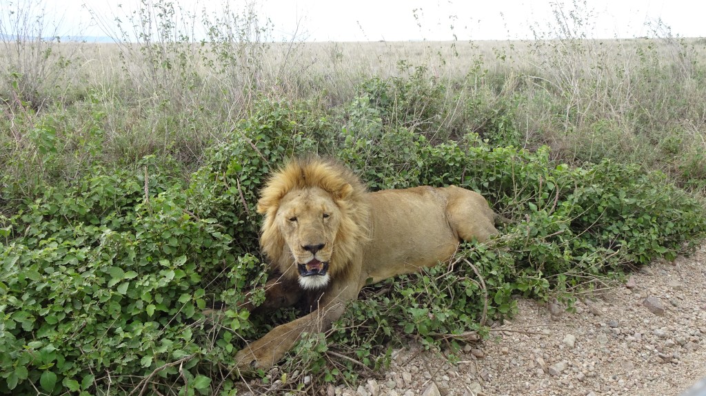 À nouveau, quelques kilomètres plus loin, nous sommes tombés sur un lion couché au bord de la route. On aurait pu le toucher !
