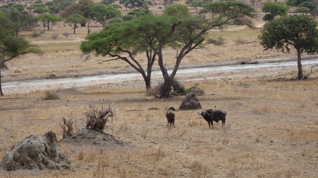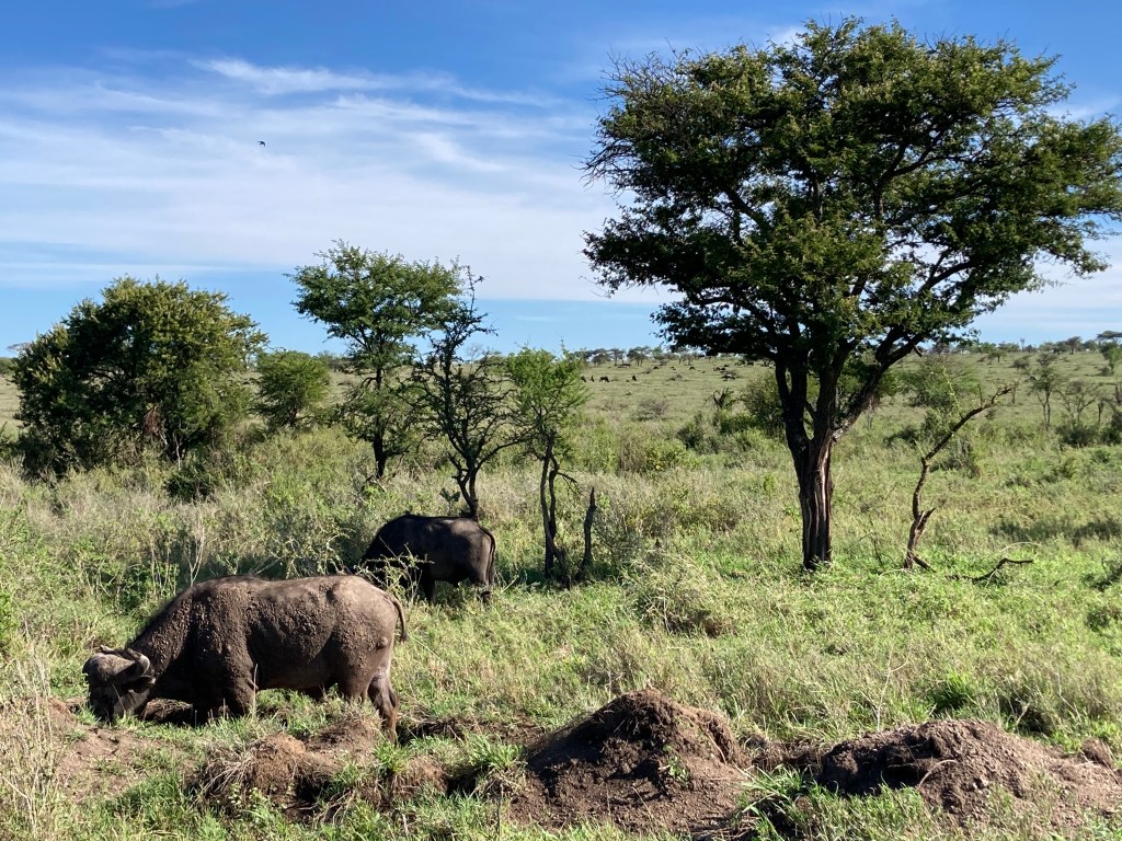 Nous partons pour notre dernière journée de safari dans le Serengeti. Nous sommes partis dans une nouvelle zone du parc. Sur le chemin, jolie rencontre avec les buffles et toujours nos hyènes, que nous retrouvons au même endroit que les jours précédents.