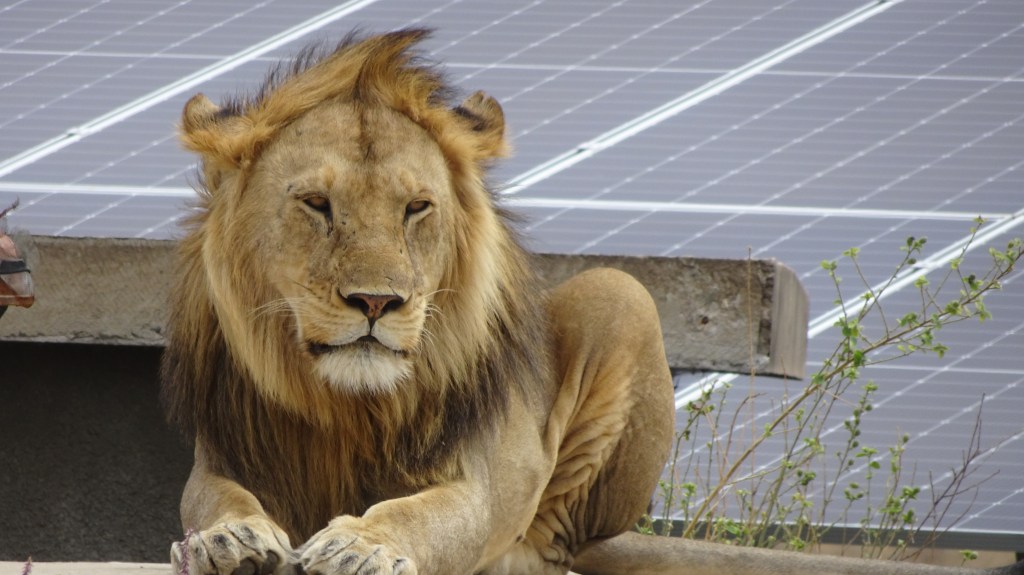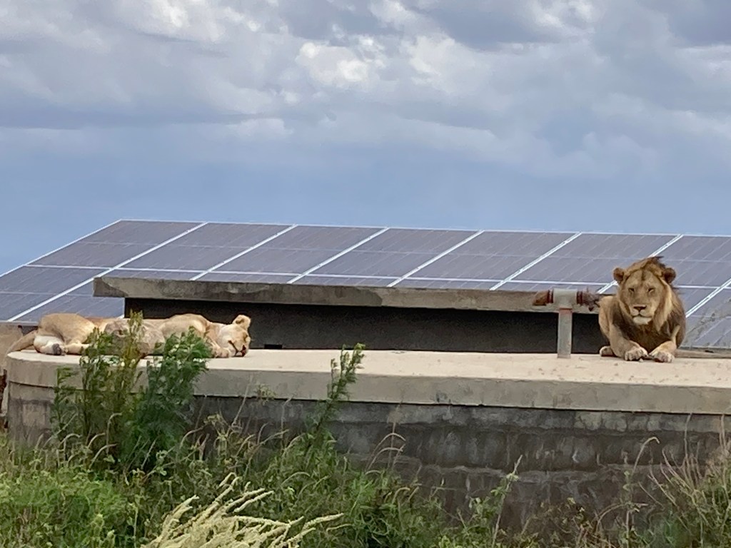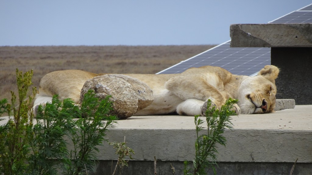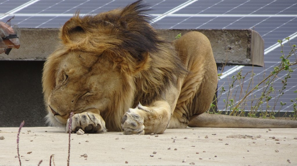 Puis, pratiquement tout de suite, après l’aire de déjeuner, nous avons trouvé un lion et une lionne couchés sur un bâtiment juste à côté de panneaux photovoltaïques !
