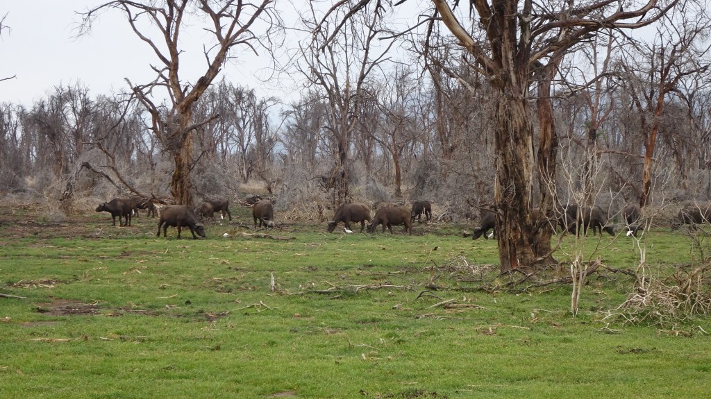 Un peu plus loin, près du bord de lac, un troupeau de buffles.