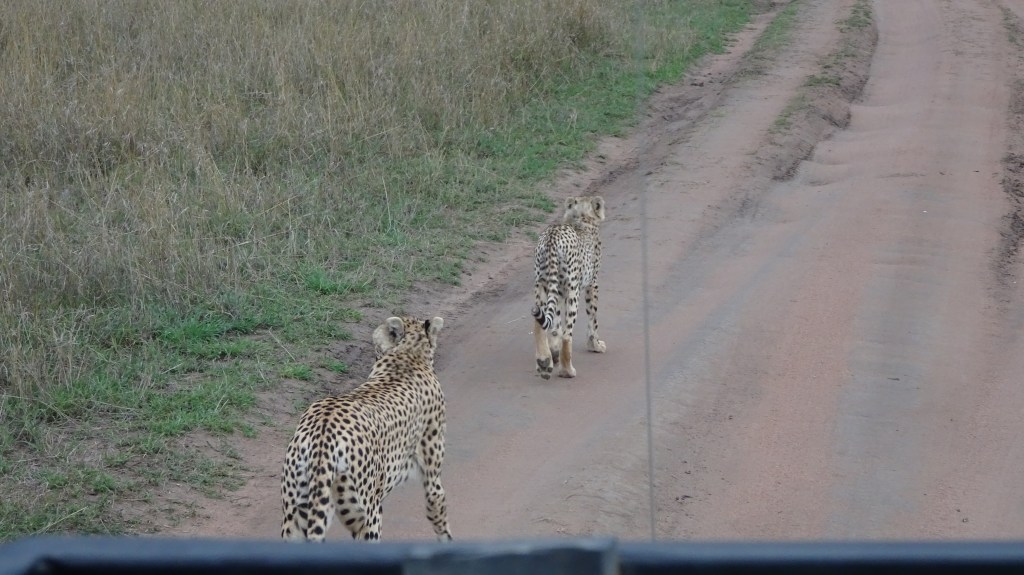 Puis en repartant, nous sommes repassés là où on avait vu les guépards et grande chance pour nous, ils étaient désormais sur le route.