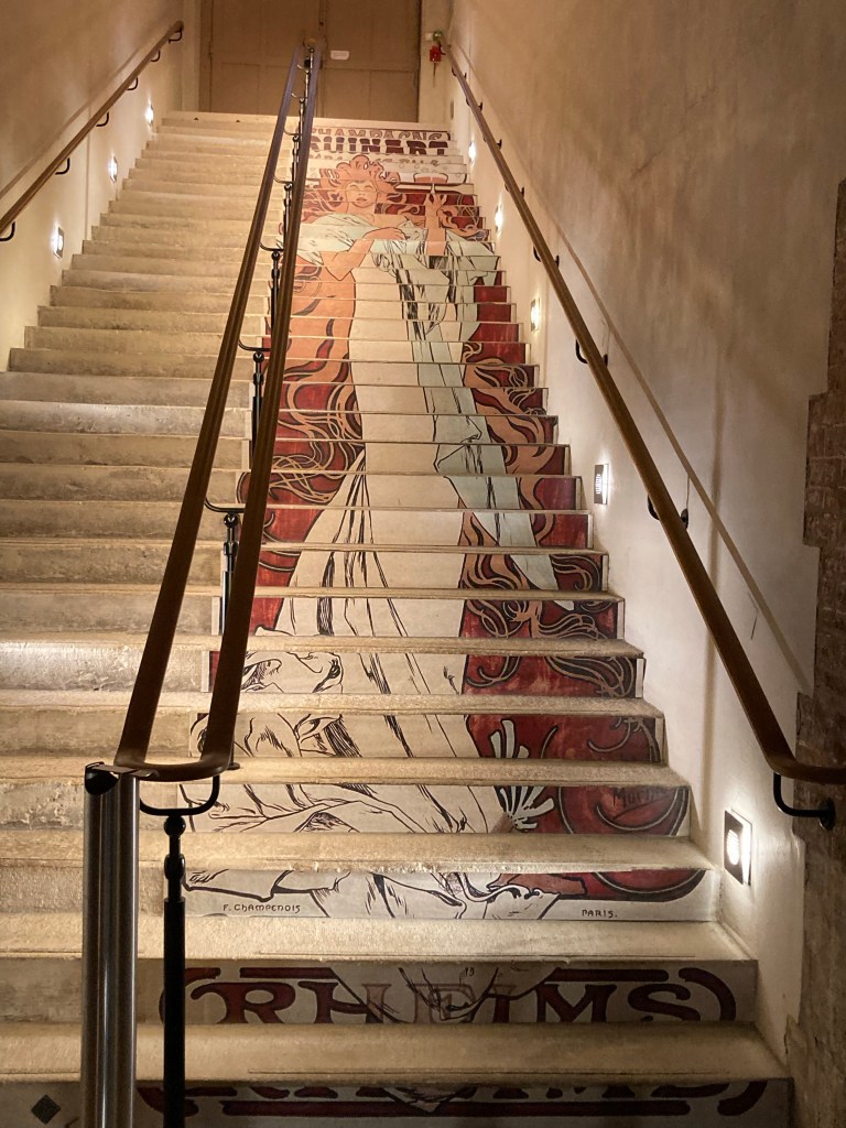 En bas des escaliers, lorsque l’on se retourne, on découvre la première affiche publicitaire de Ruinart qui fit scandale à l’époque. Une femme seule buvant du champagne !