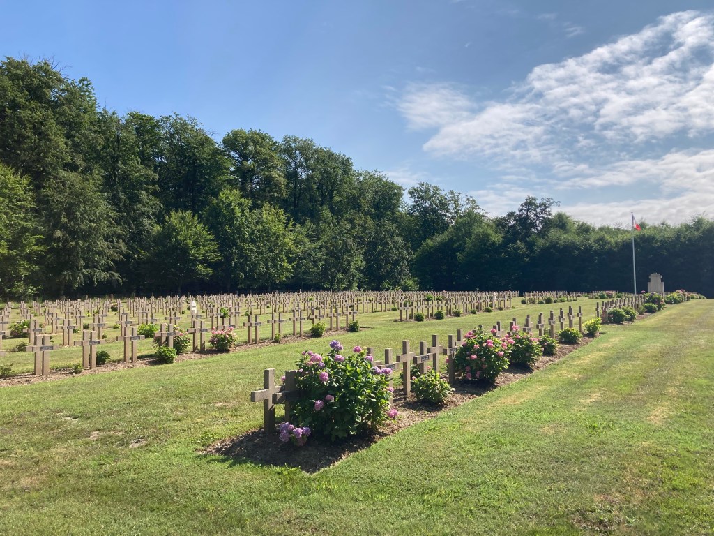 Le cimetière de la Forestière : ici reposent 220 poilus morts en Argonne. Il est fleuri d’hortensias bleus, blanc et roses.