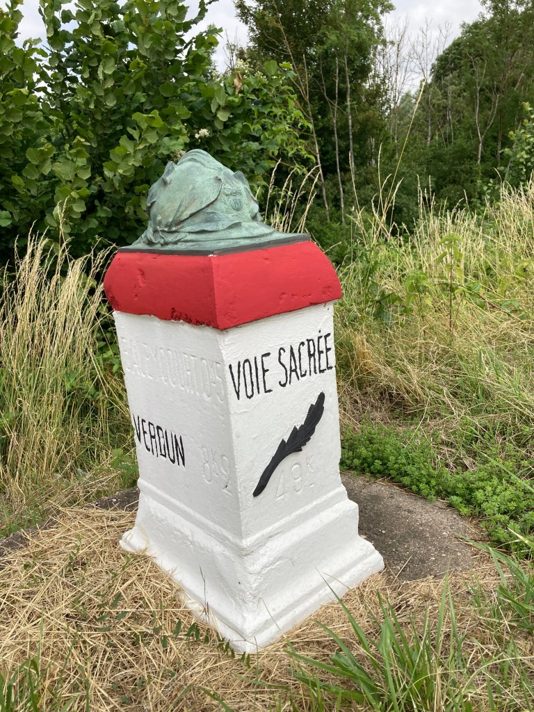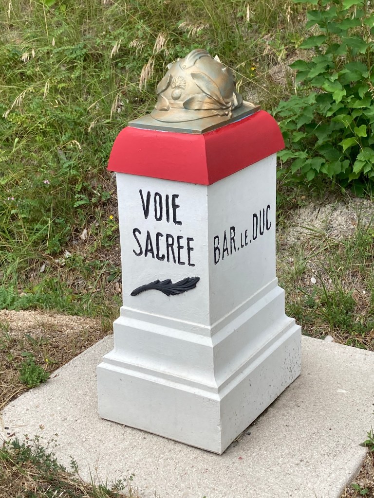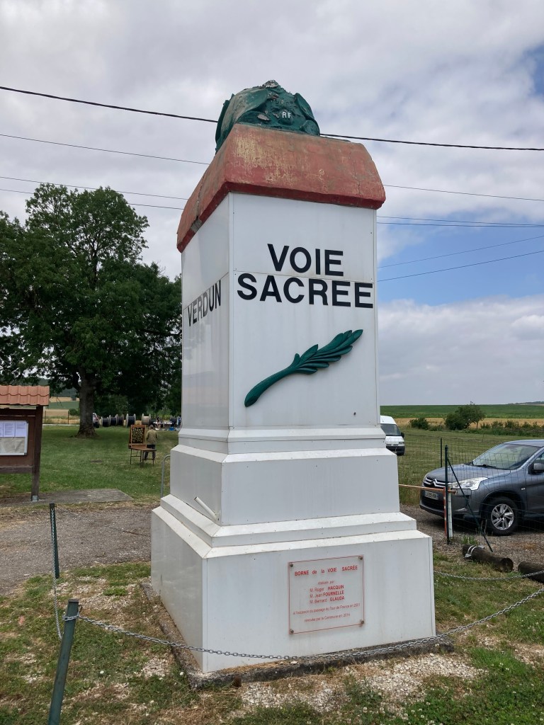 Ensuite, nous avons attaqué notre descente vers le Sud en empruntant La Voie Sacrée. C’est la seule route nationale de France à ne pas être désignée par un numéro. Elle commence à Bar-le-Duc et se termine 55 km plus loin à Verdun. Chaque kilomètre de cette route, qui a joué un rôle primordial pendant la Première Guerre mondiale, est marqué d’une borne blanche et rouge, surmontée d’une sculpture en bronze représentant un casque de poilu.