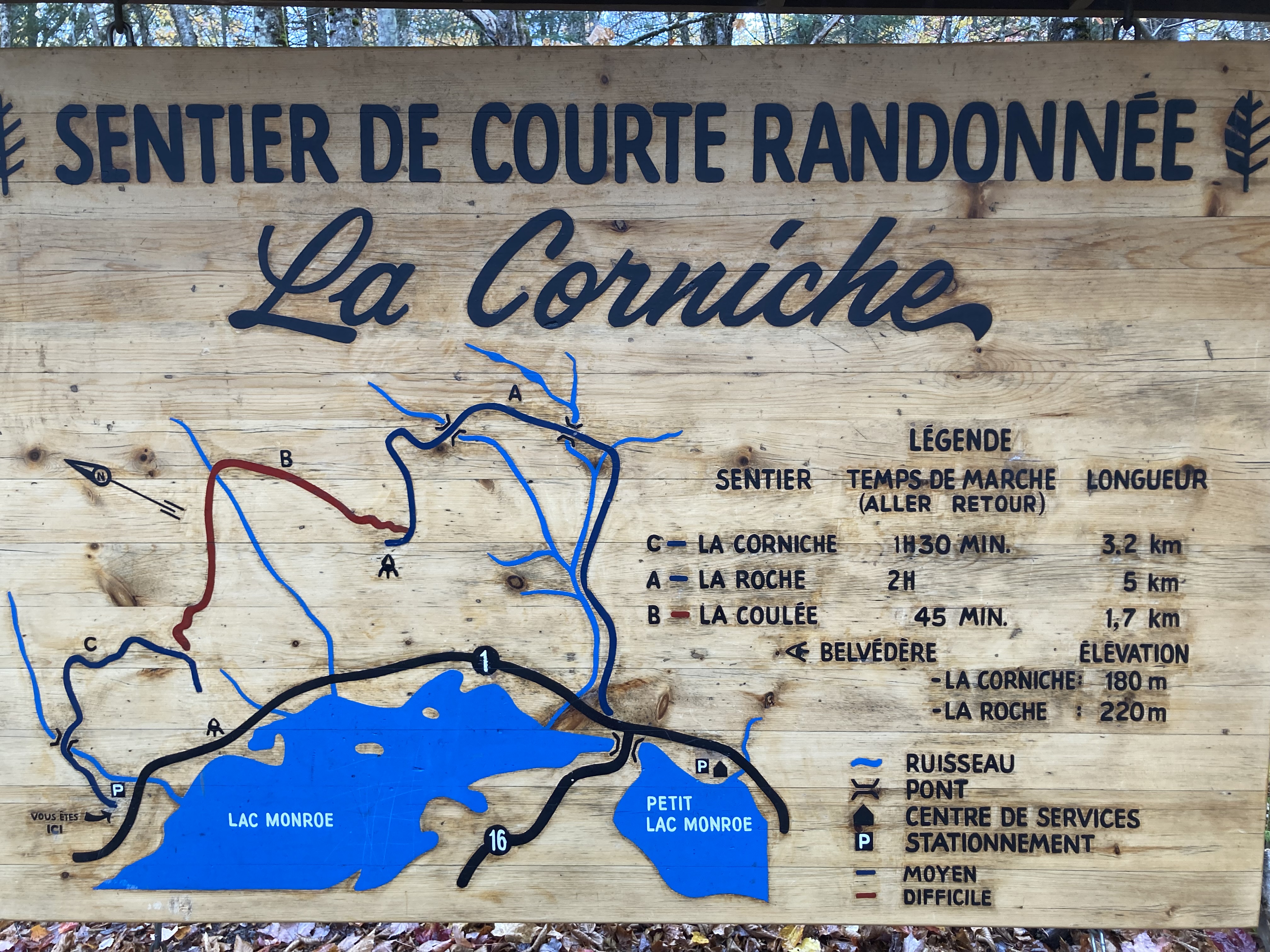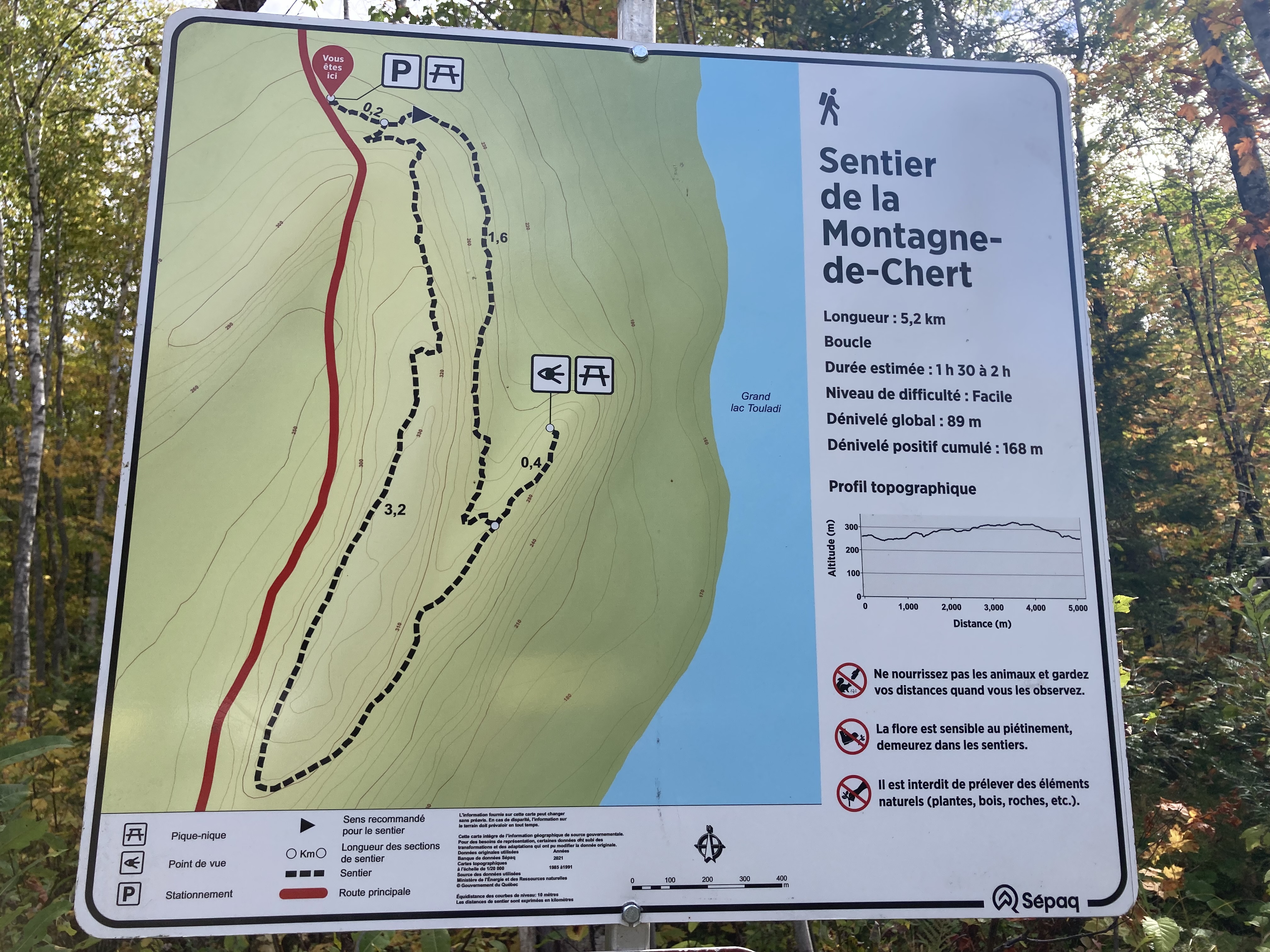 Petite randonnée dans le Parc National du Mont Tremblant, Secteur de l’Assomption : les grandes vallées, 4,6 km, 268 mètres de dénivelé. Une agréable ascension à travers une érablière avec à l’arrivée une très belle vue sur le Lac de L’Assomption.