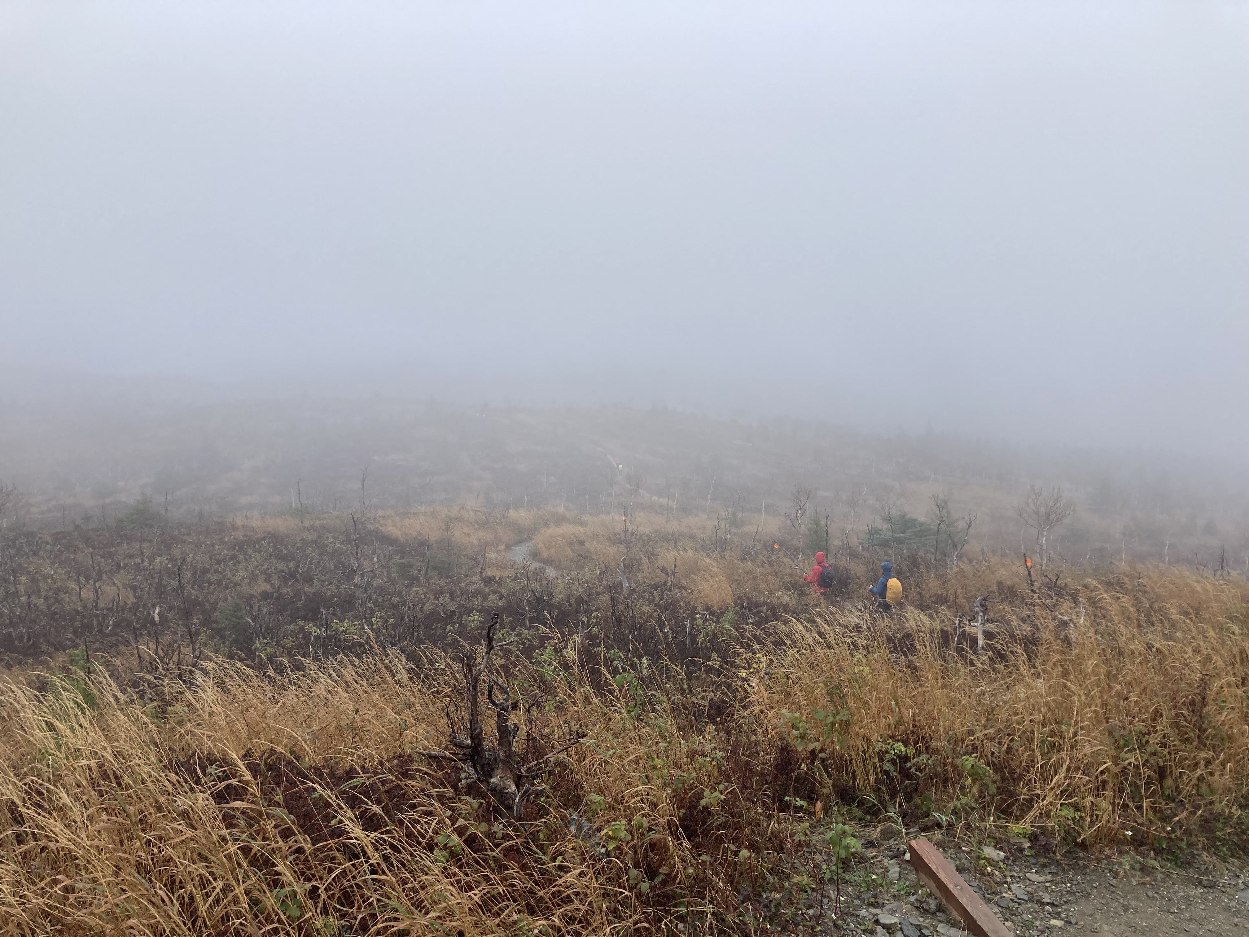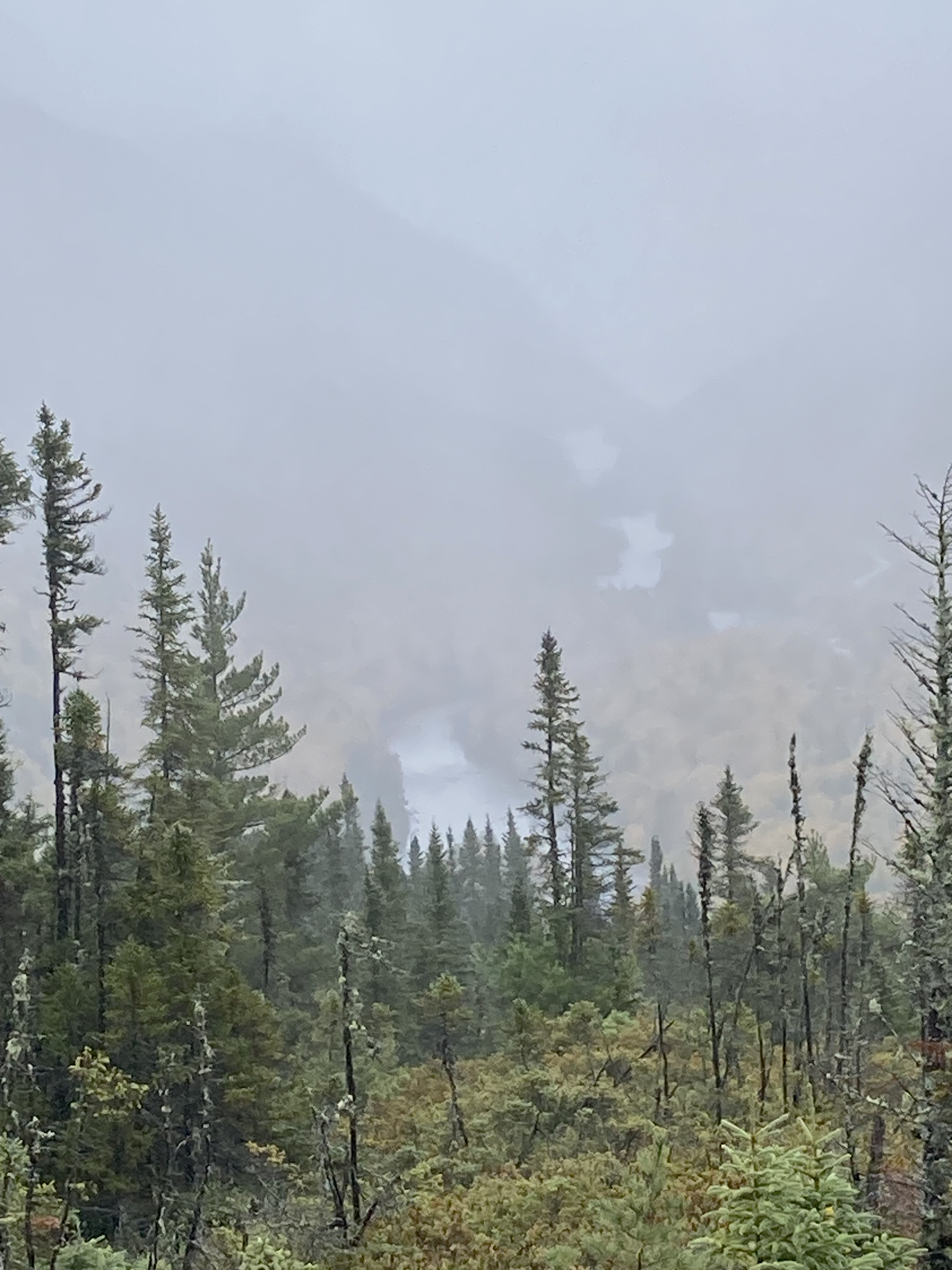 Arrivés au parc, le temps était très couvert avec une pluie fine et beaucoup de brouillard. Les guides sur place nous indiquent que nous ne verrons aucun point de vue du fait du brouillard et nous conseille de nous rendre sur un autre site du parc, Arthabasca. C’est ce que nous avons fait. Nous avons donc réalisé la randonnée du Sentier du Brûlé, une boucle d’un peu plus de 11 km.