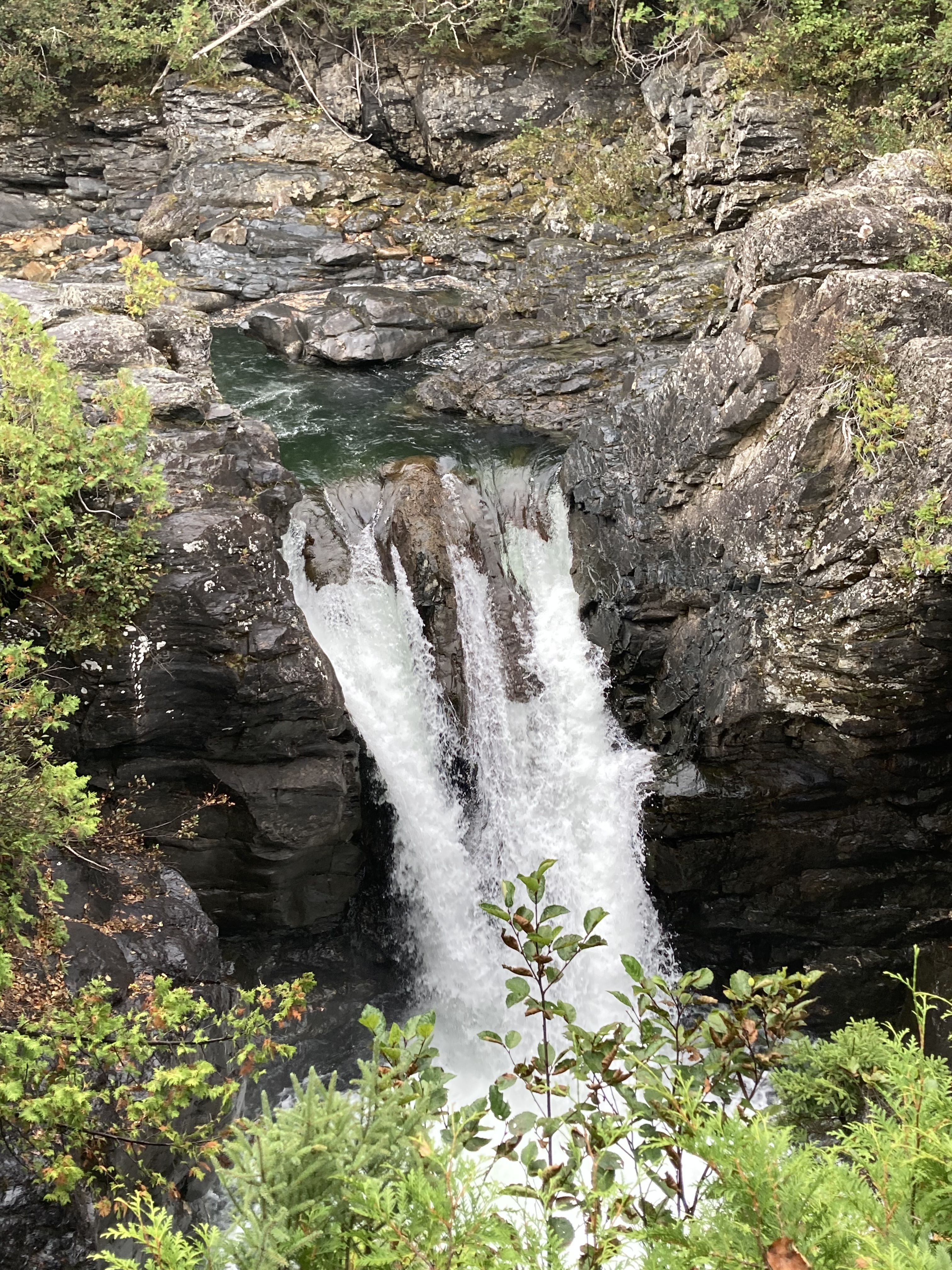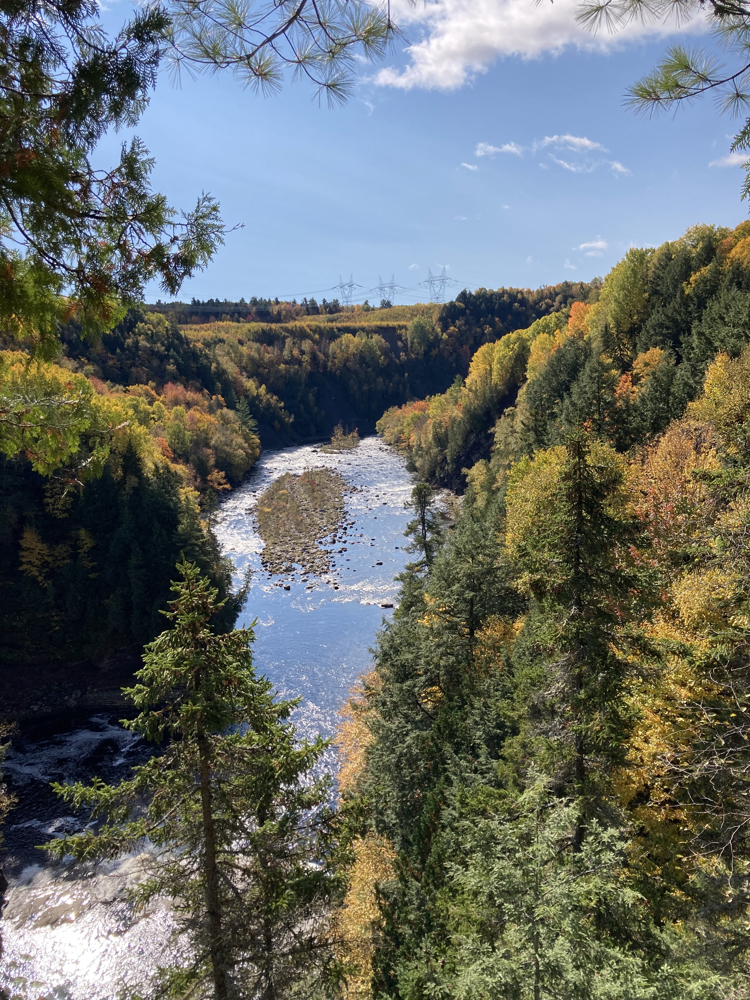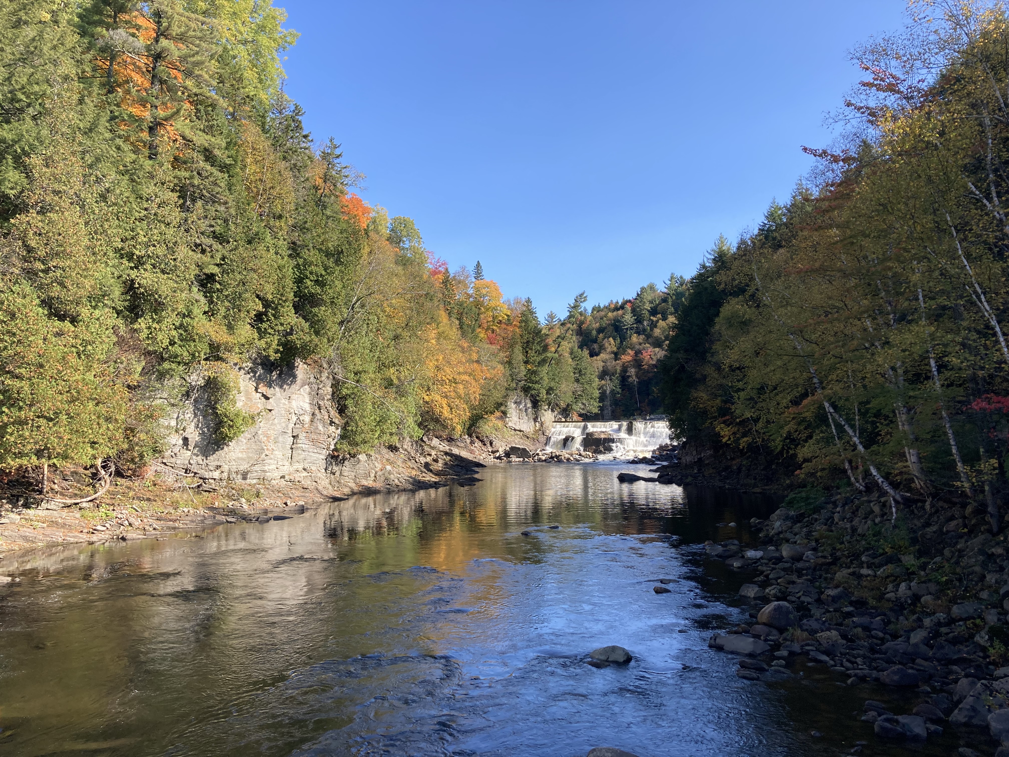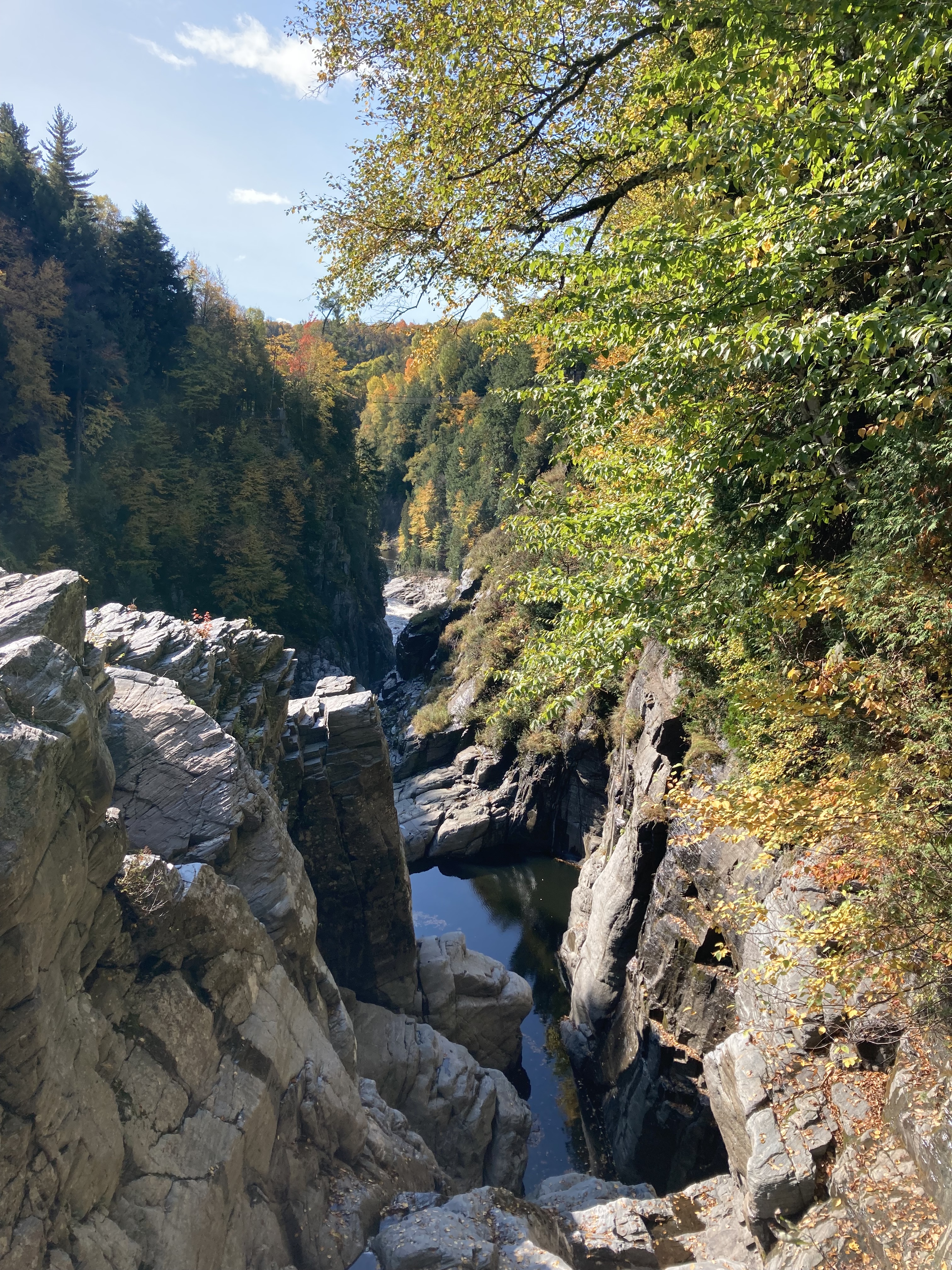 Chute Sainte-Anne : nous nous sommes garés au petit parking tout près de la chute, puis nous avons marché un petit moment le long de la rivière.