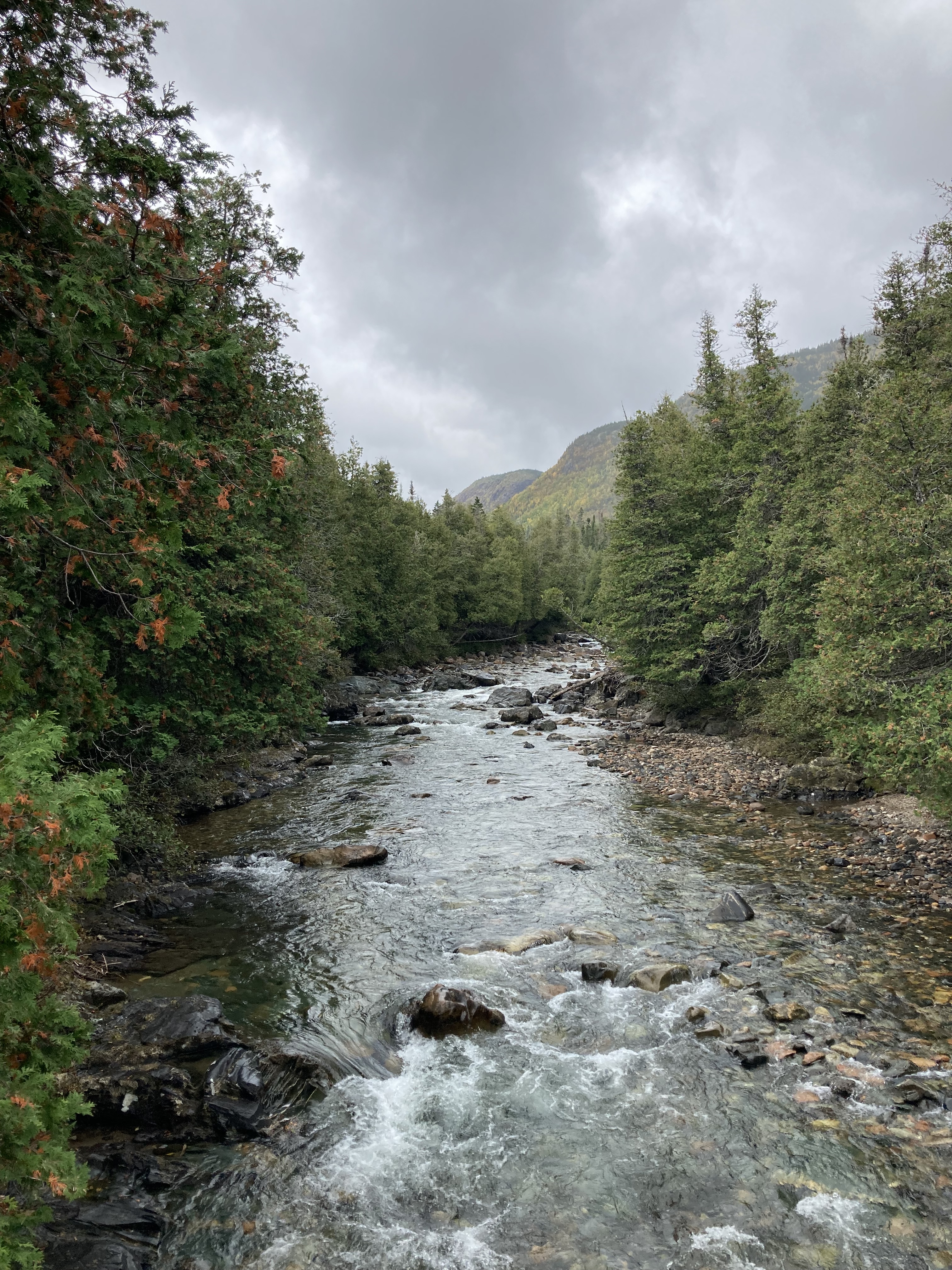 Ensuite, nous comptions faire la randonnée de la Rivière-aux-Emeraudes. Le parking gratuit où nous comptions nous arrêter pour faire la randonnée de 14 km aller-retour était fermé. Nous avons continué la route jusqu’au parking suivant. Mais il fallait alors payer l’entrée du parc (12 dollars canadiens par personne) et la randonnée ne faisait plus que 2 km aller retour. On a trouvé que cela faisait cher pour, juste, aller voir une cascade du coup on n’est pas resté.
