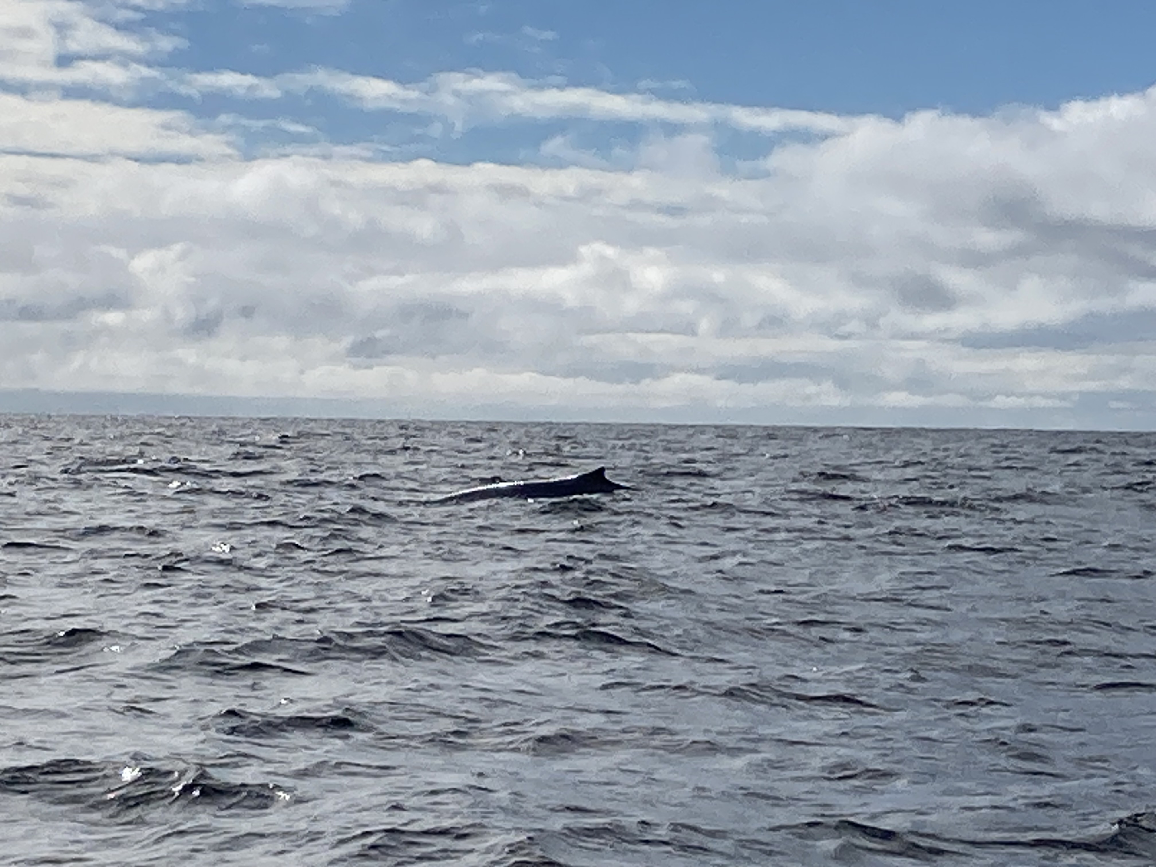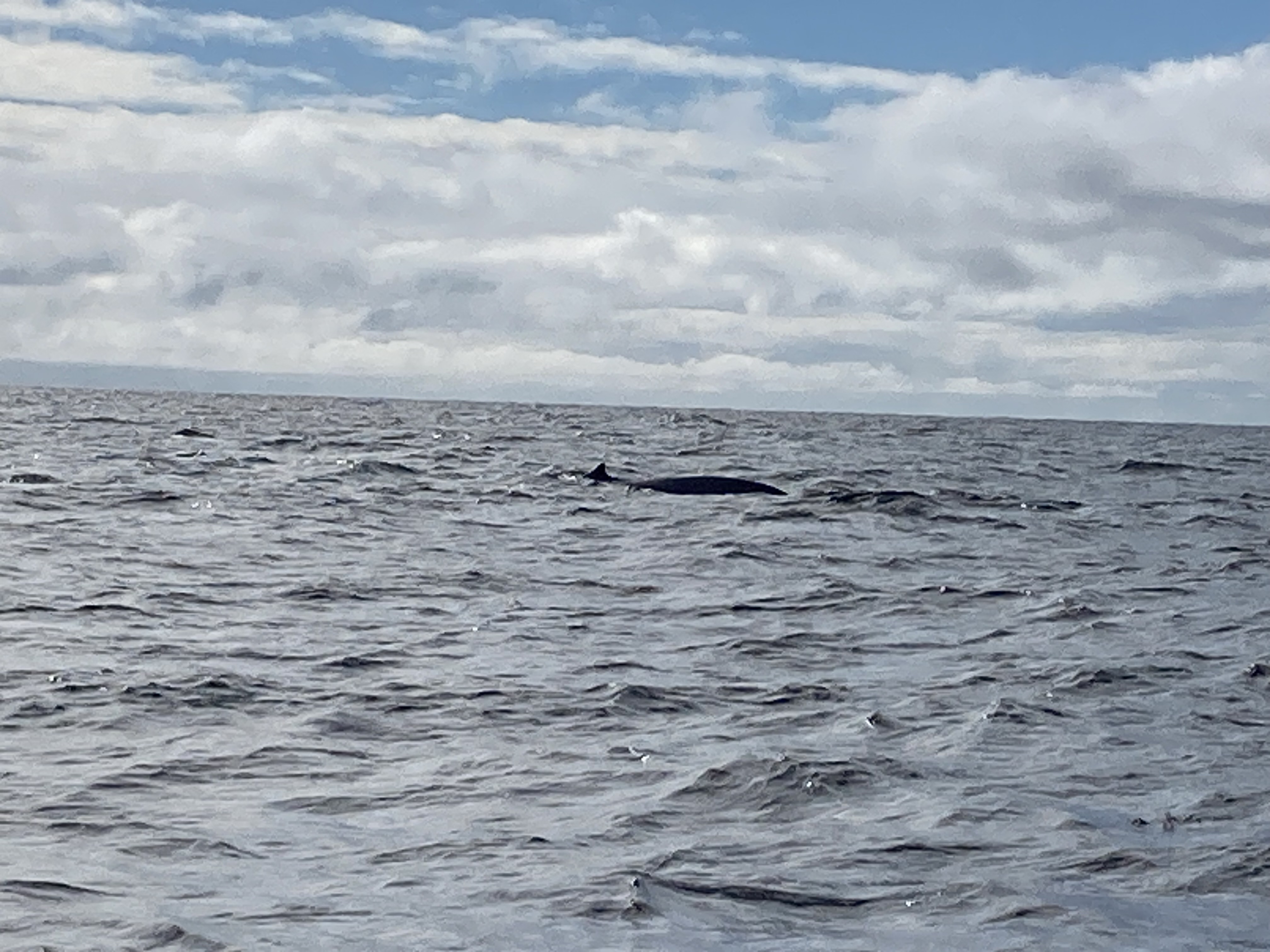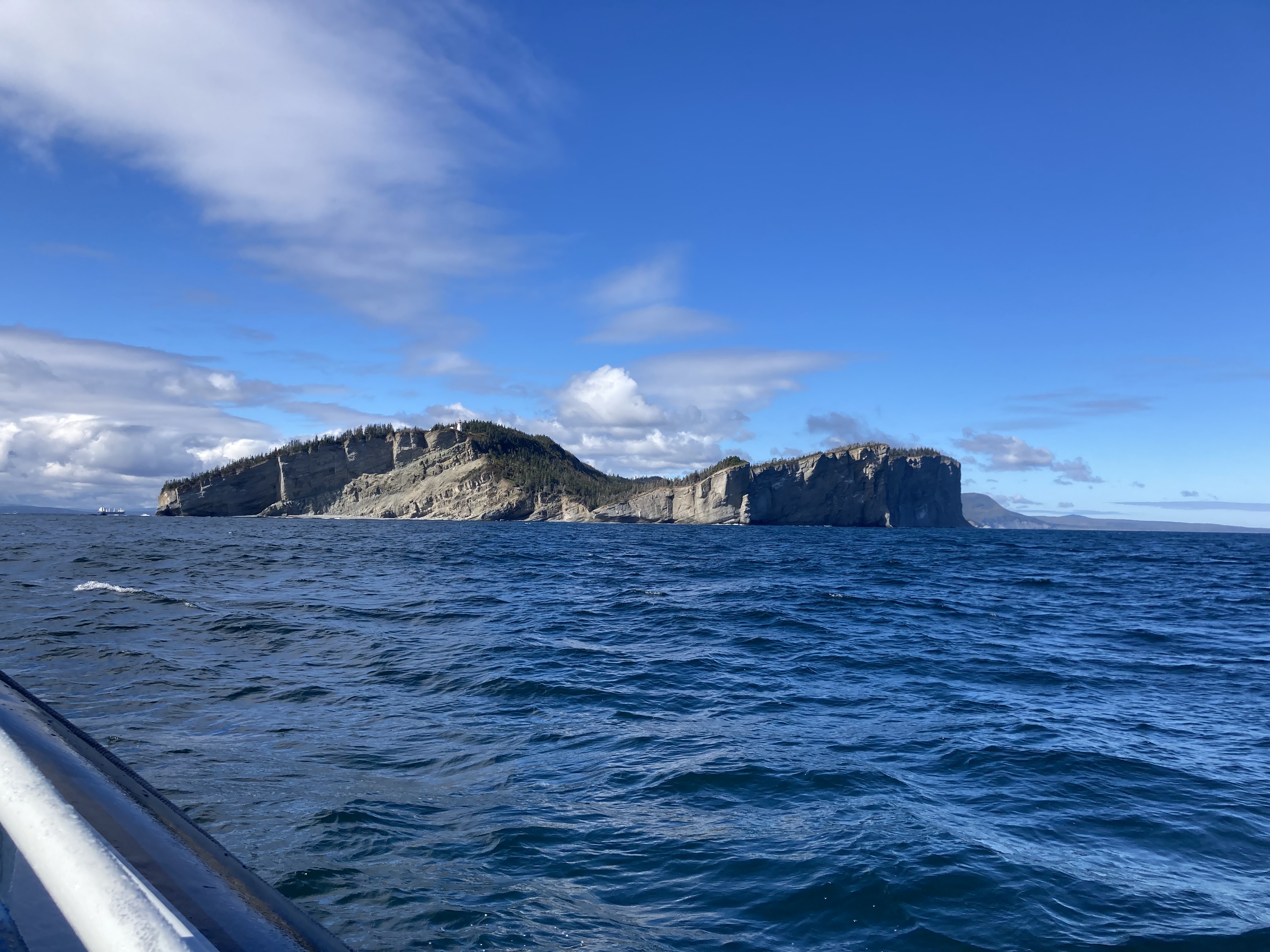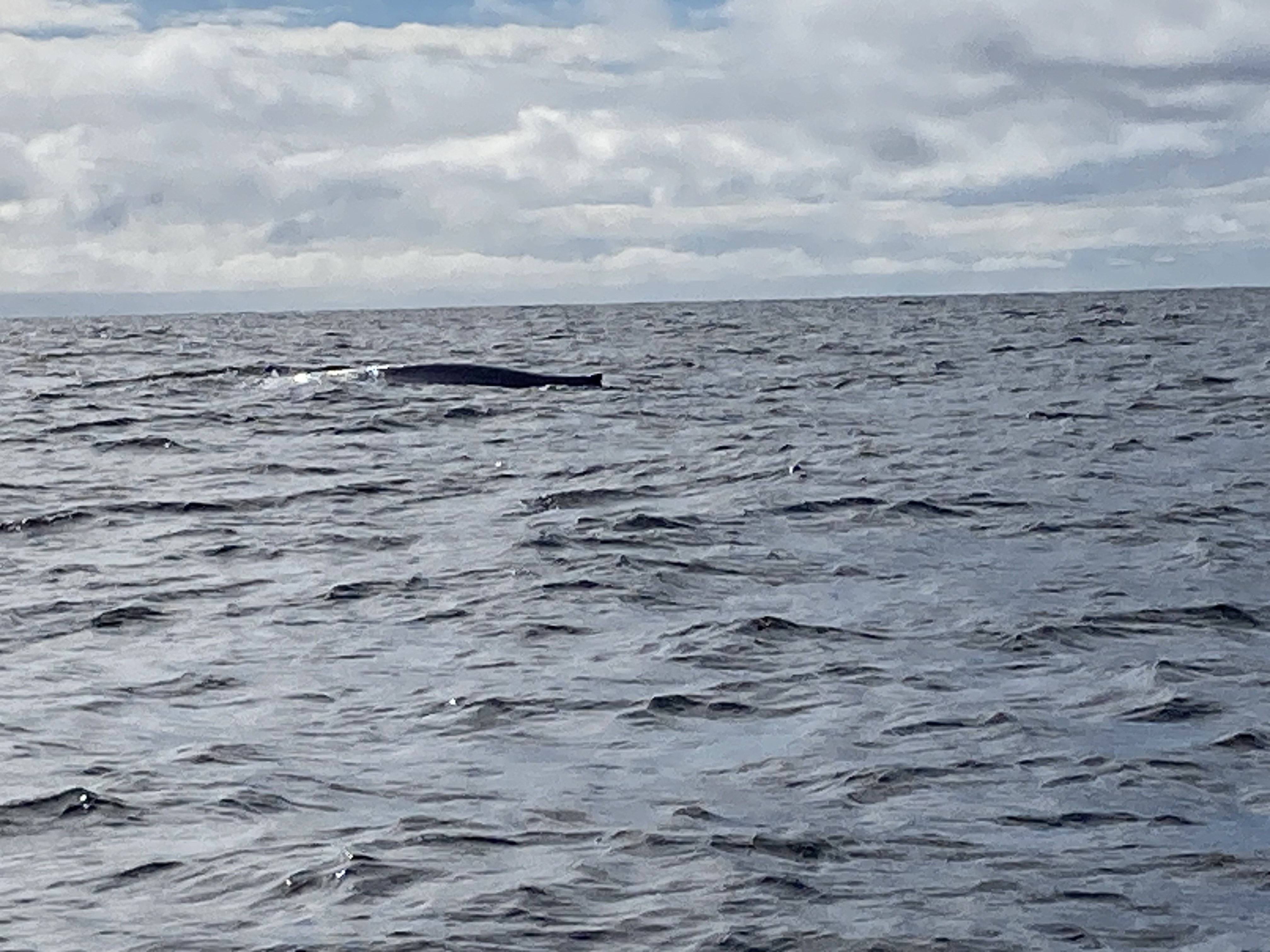 Nous voilà partis pour environ 2h30 de croisière. Nous sommes allés assez loin après le Cap Gaspé. Cela faisait plus d’une heure que l’on naviguait et toujours rien. Et enfin, nous avons vu un souffle de baleine. Il s’agissait d’un rorqual commun qui mesure plus de 20 mètres. Puis nous avons vu une deuxième baleine, un rorqual bleu beaucoup plus gros. Nous les avons observé un bon moment, les recherchant dans l’eau quand ils replongeaient dans l’eau.