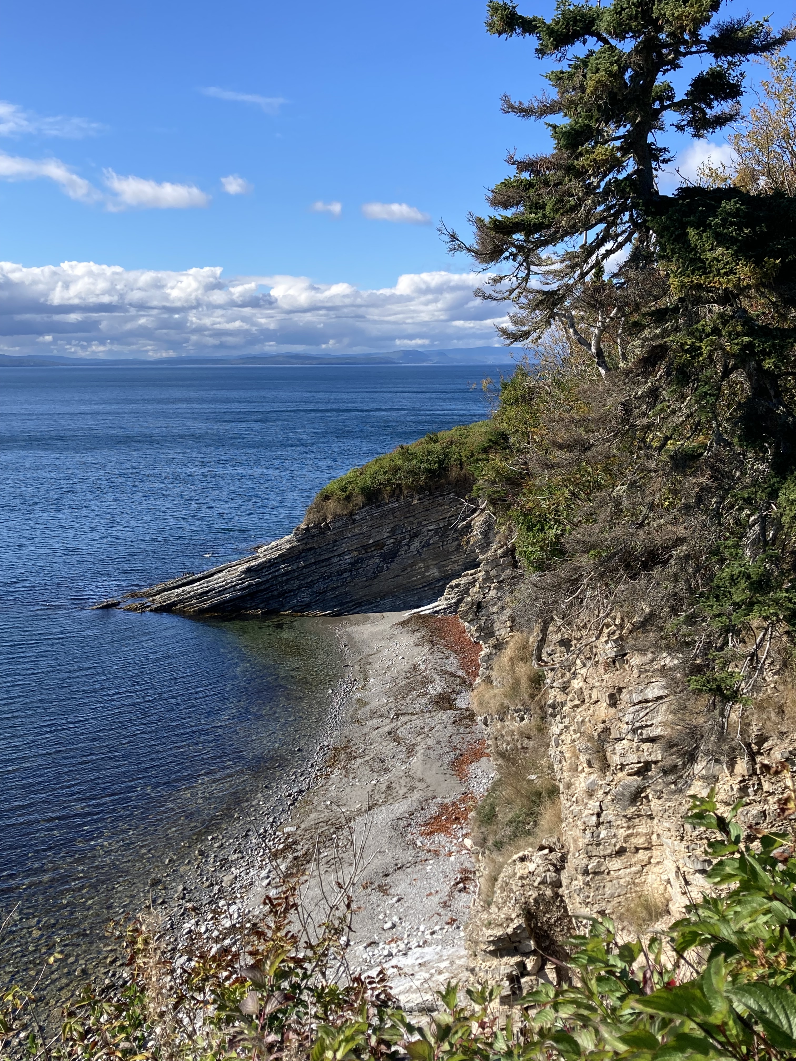 1er arrêt : Parc National du Fjord-du-Saguenay, secteur Baie Sainte-Catherine. Parc compris dans notre pass des parcs de la SEPAQ. Nous avons fait la randonnée de la Halte aux Bélugas (6,4 km aller retour), l’endroit est en travaux donc nous avons marché 400 m de plus pour le site d’observation suivant. Cette baie est réputée pour être la baie des bélugas mais à cette époque de l’année, ils sont plus à l’entrée du fjord, là où on les a vu la veille. Donc pas de bélugas pour nous aujourd’hui.