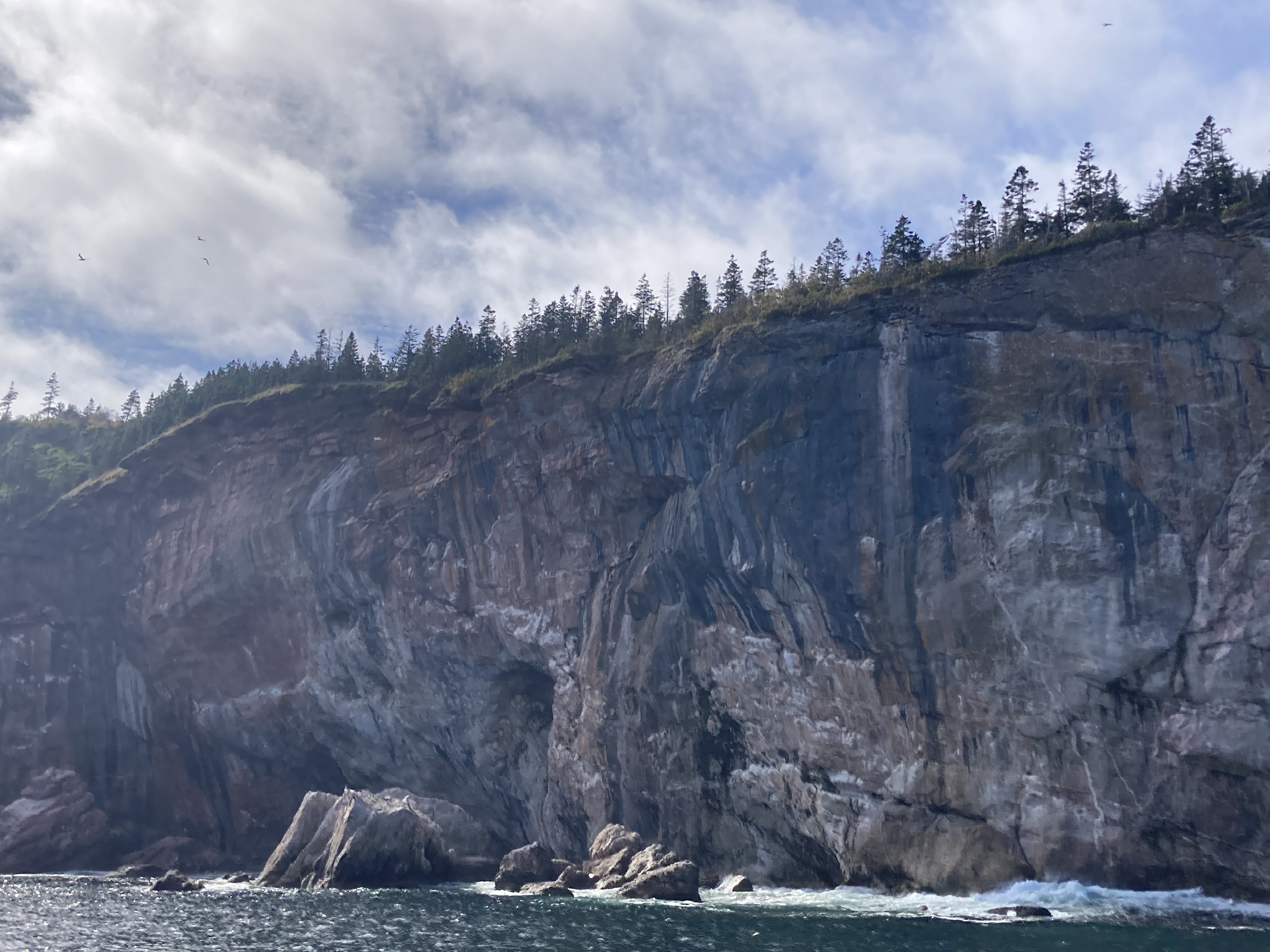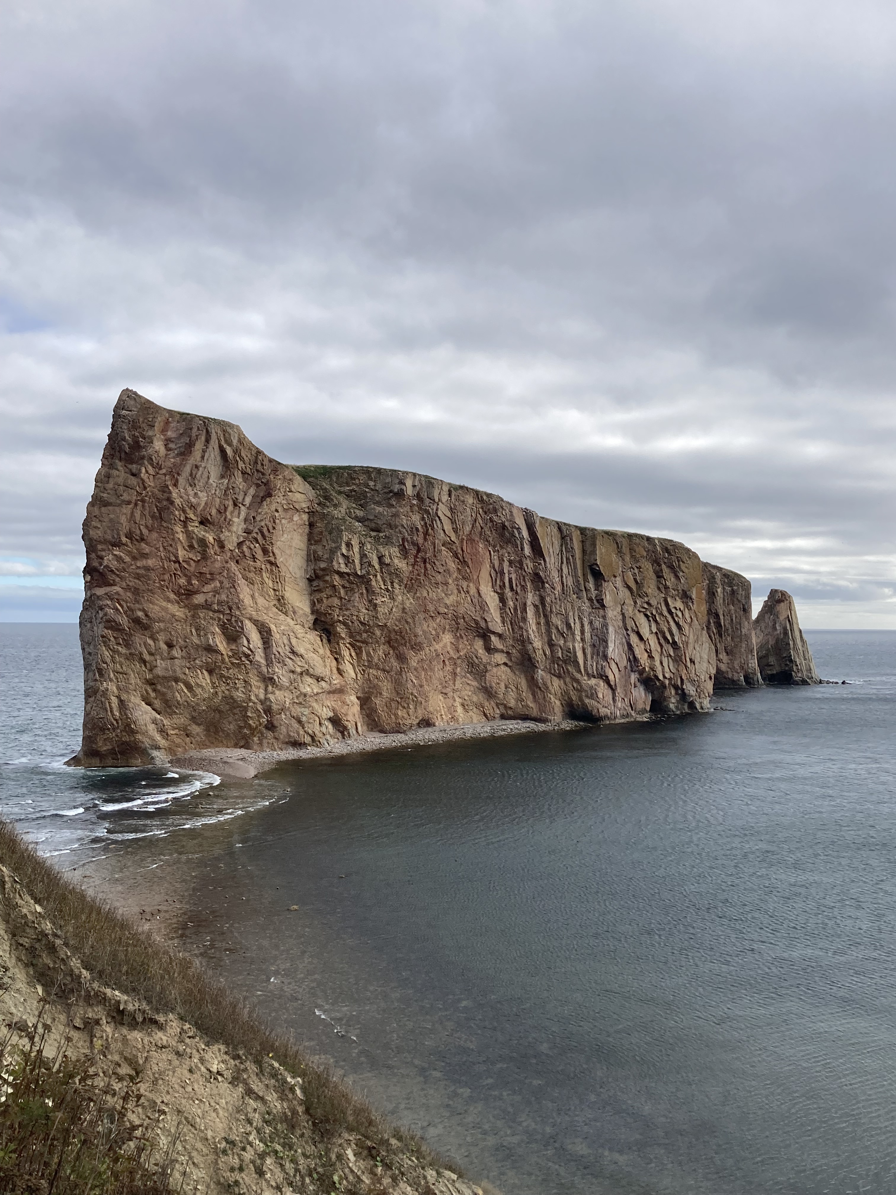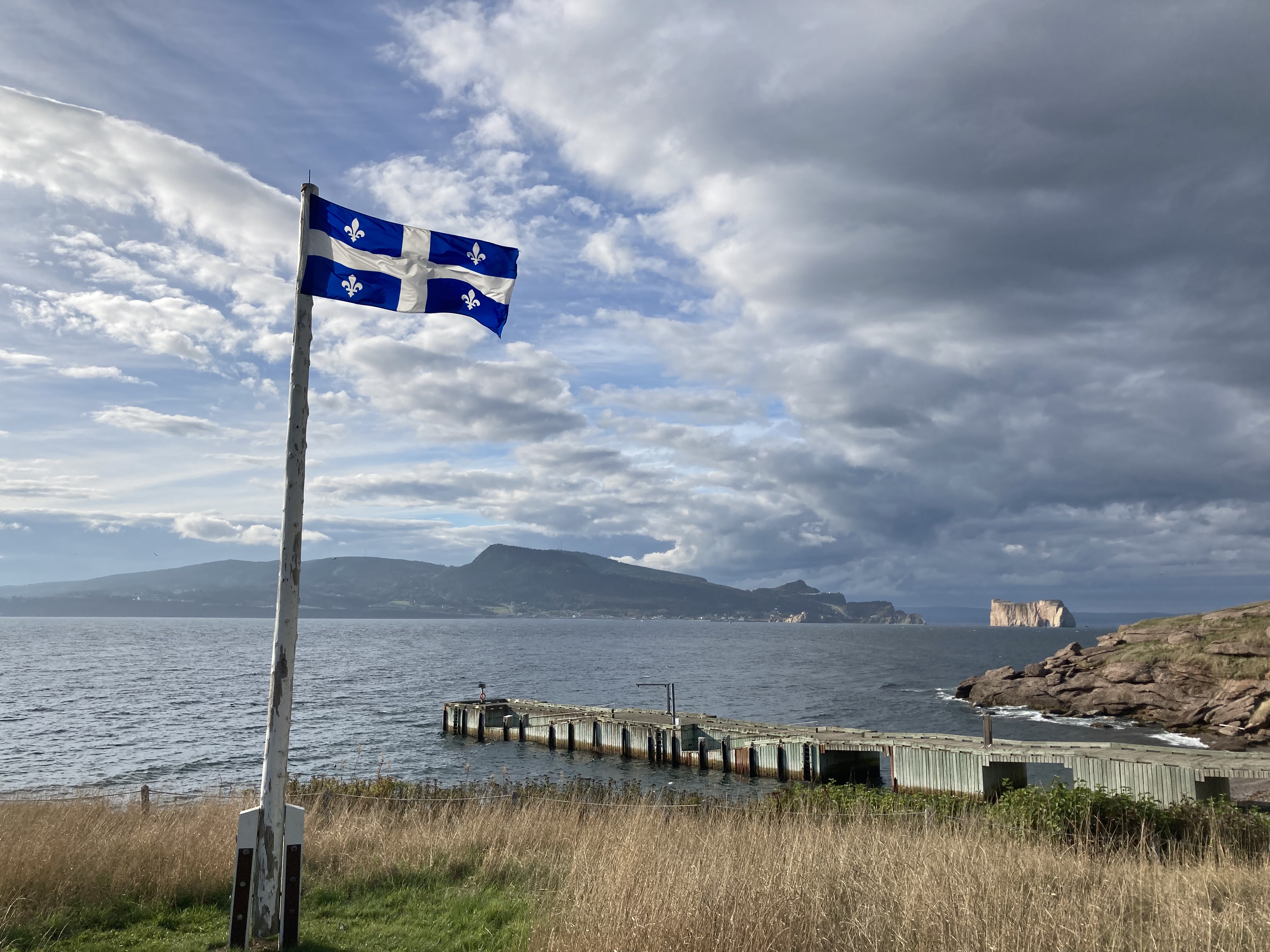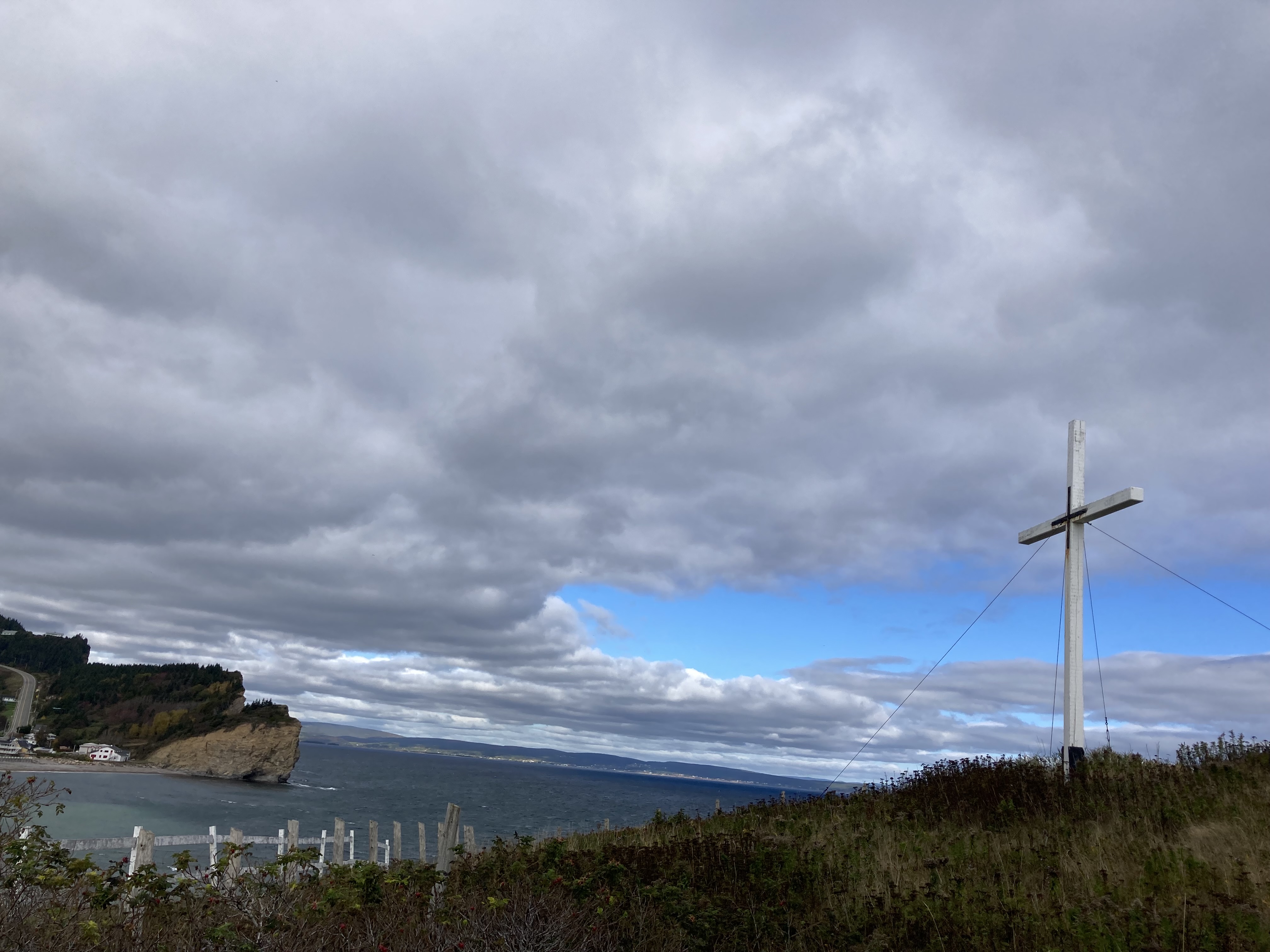 Nous sommes partis, ce matin, du Gîte du Mont Albert direction Gaspé. Le temps était encore un peu pluvieux. Nous avons pris la route qui longe tout le long le Saint Laurent. Nous avons pu observer à deux reprises des phoques sur les rochers.