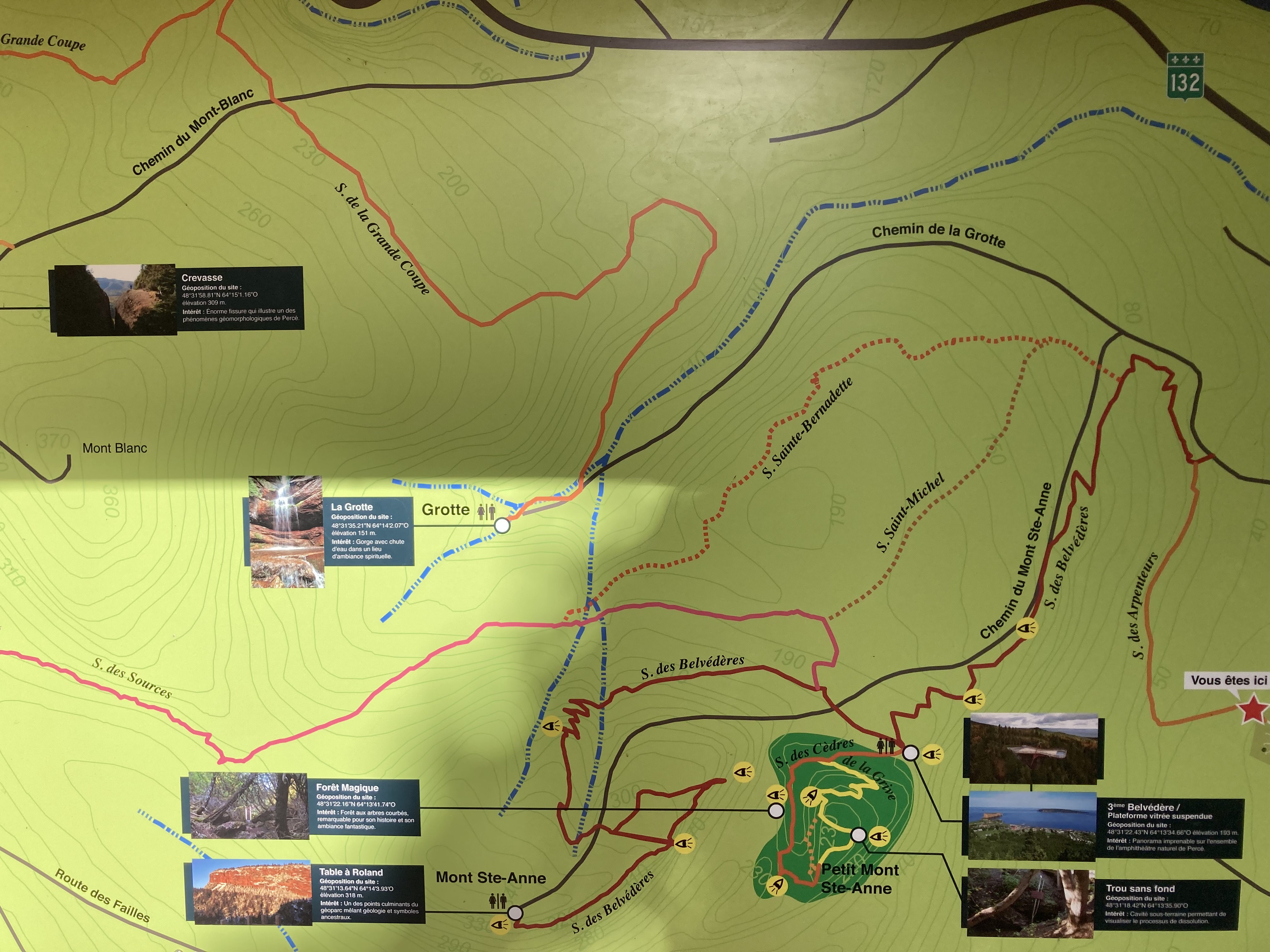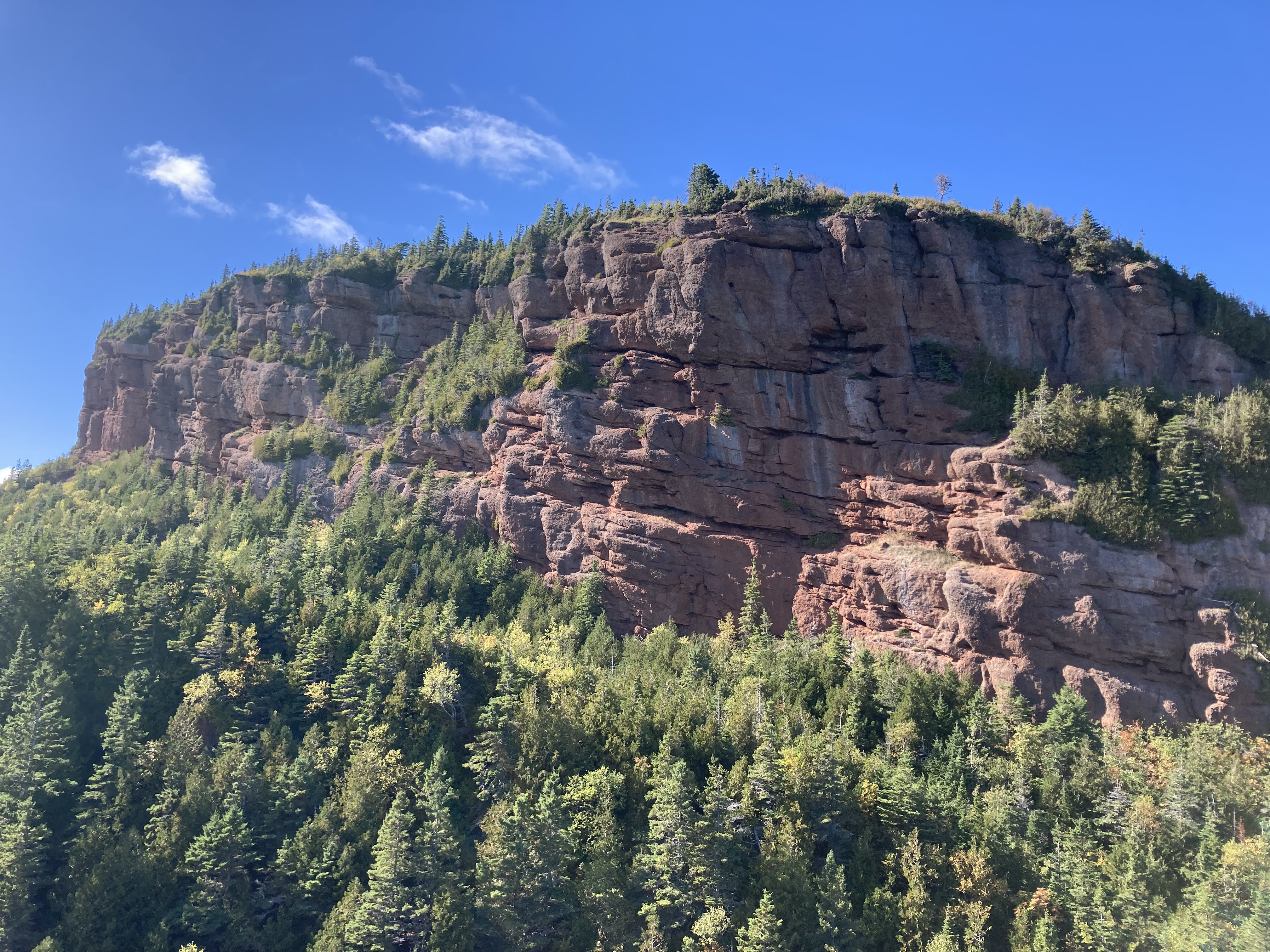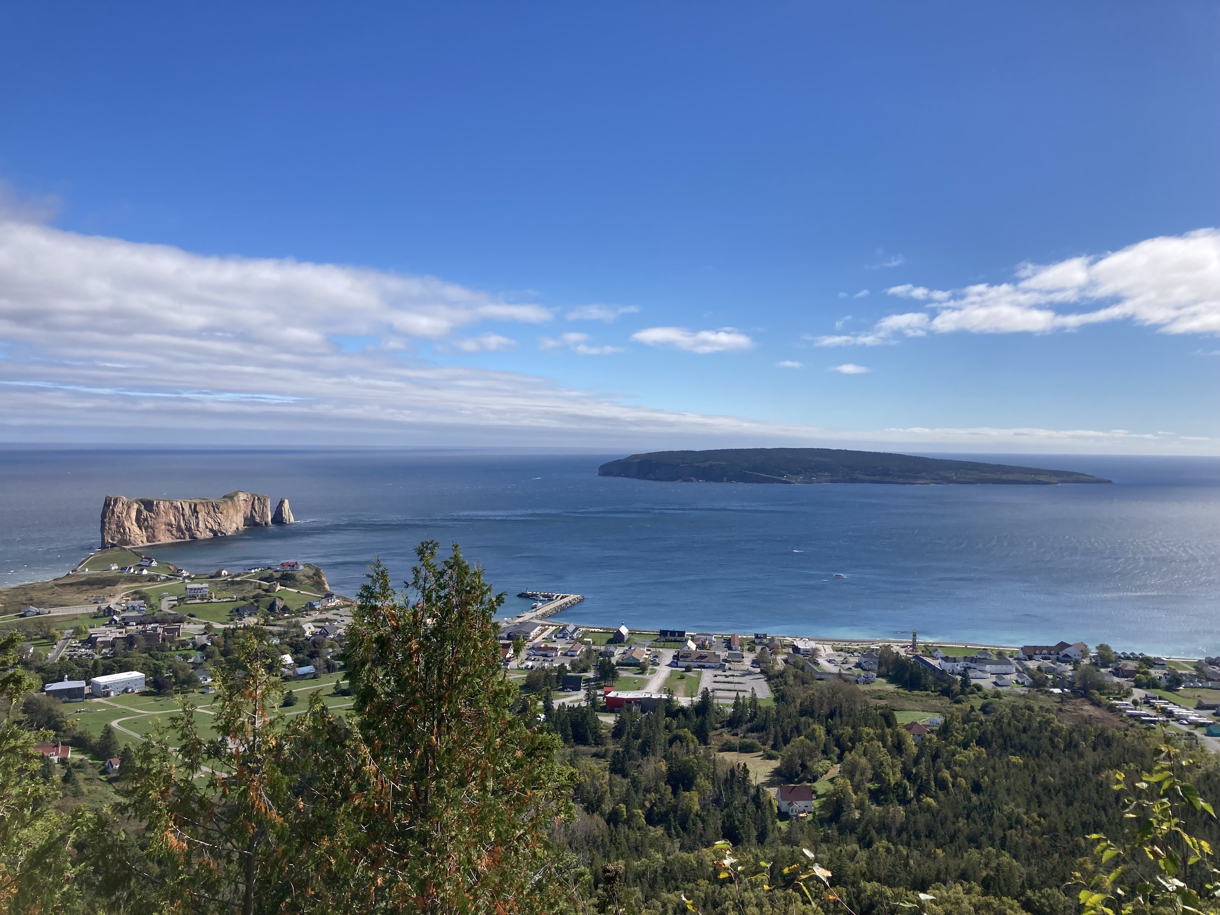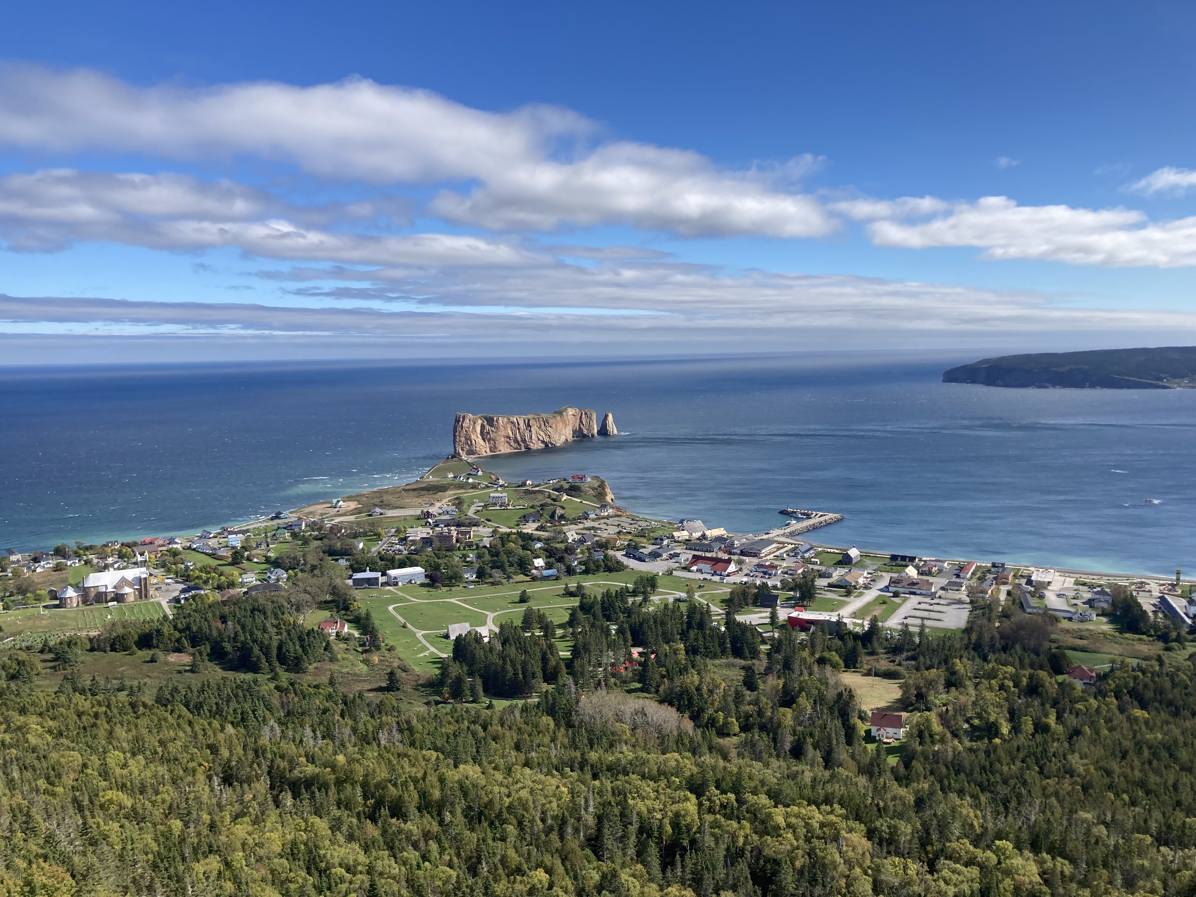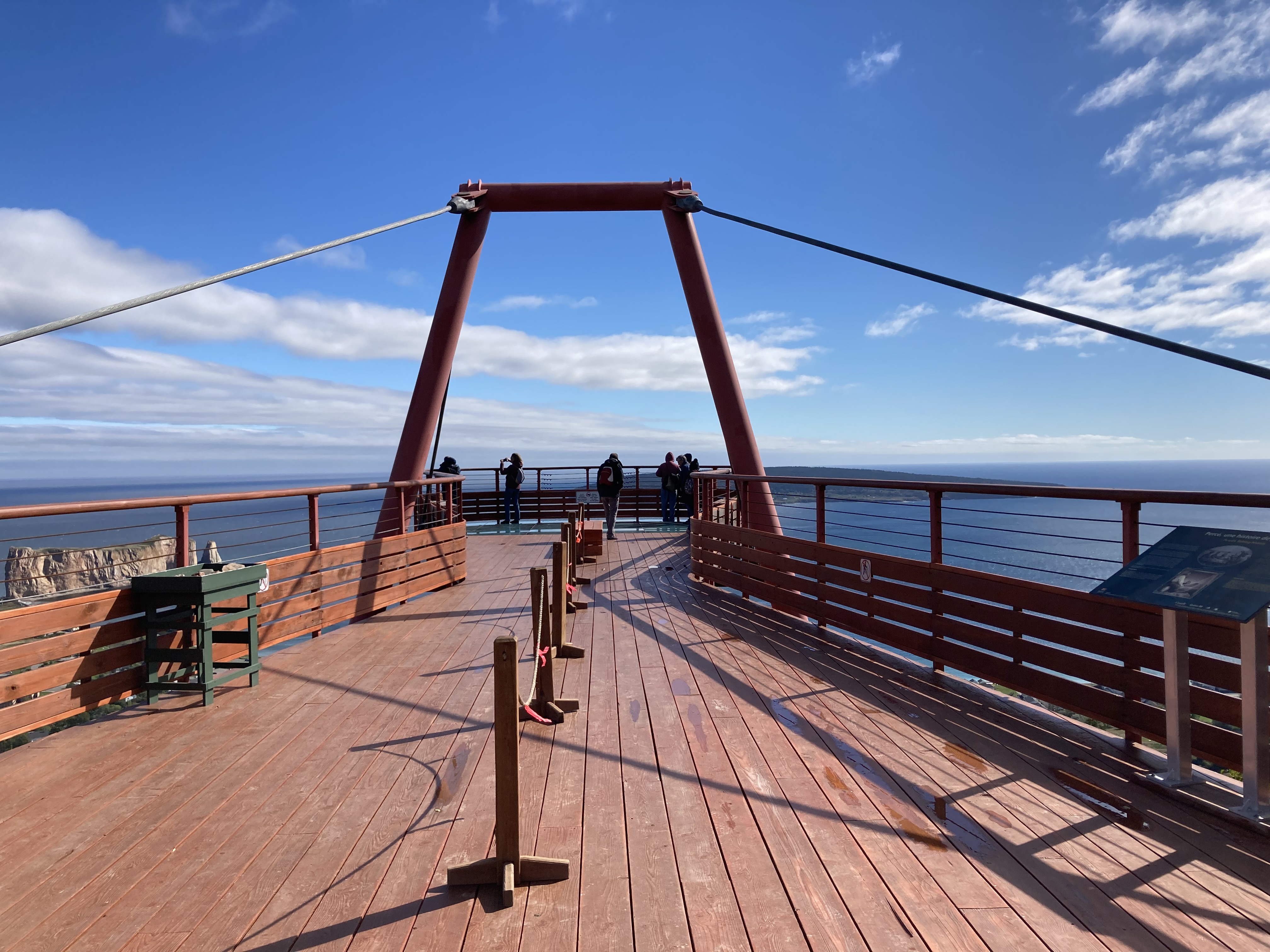 Nous avons enchaîné avec le Géoparc de Percé. On y trouve plusieurs sentiers de randonnée avec de très nombreux belvédères. L’ensemble est gratuit hormis la plate-forme vitrée suspendue à 200 mètres d’altitude. On peut y monter à pieds, comme nous, ou alors en navette. Nous avons fait plusieurs sentiers pour un total d’un peu plus de 10 km.