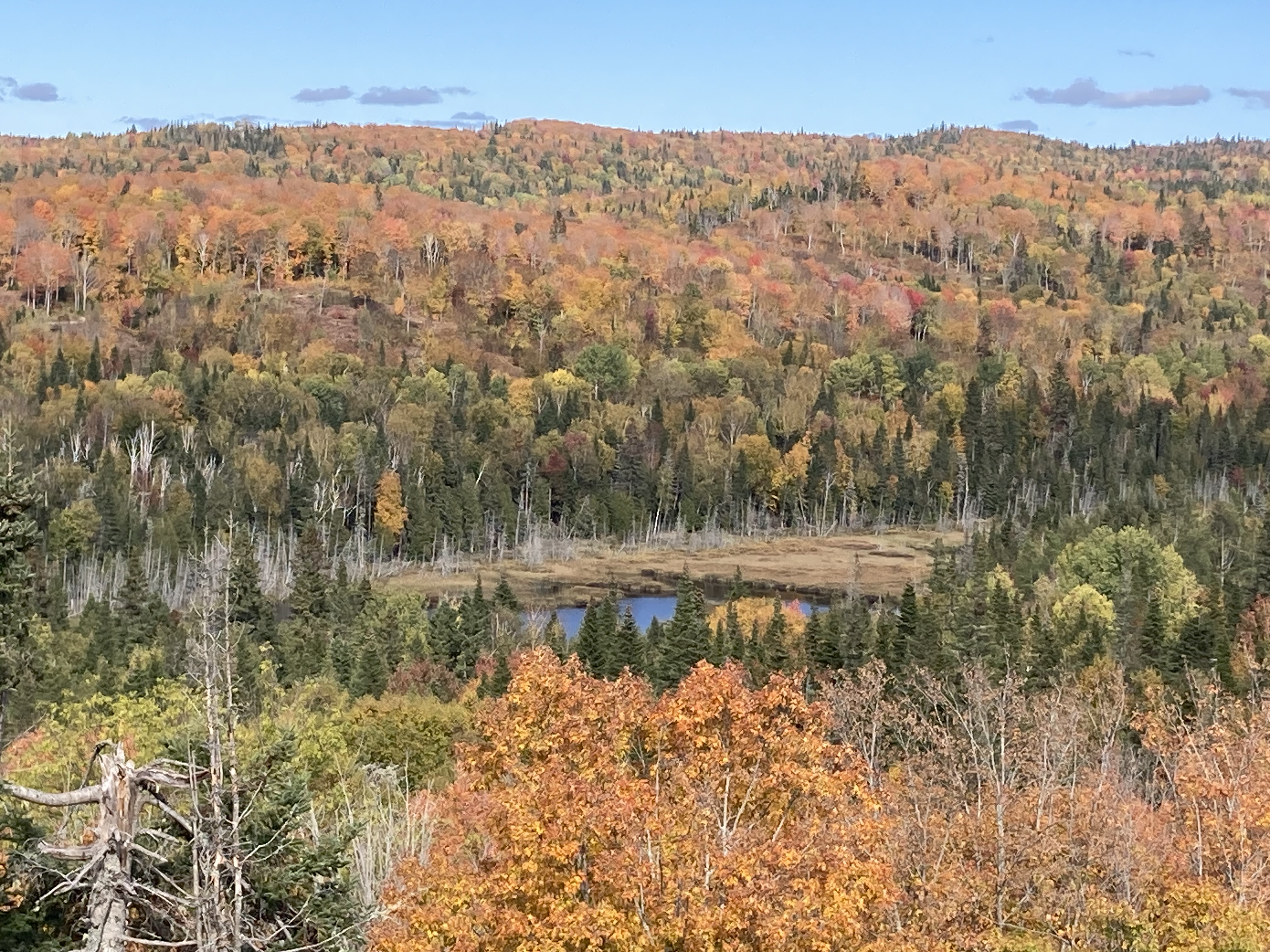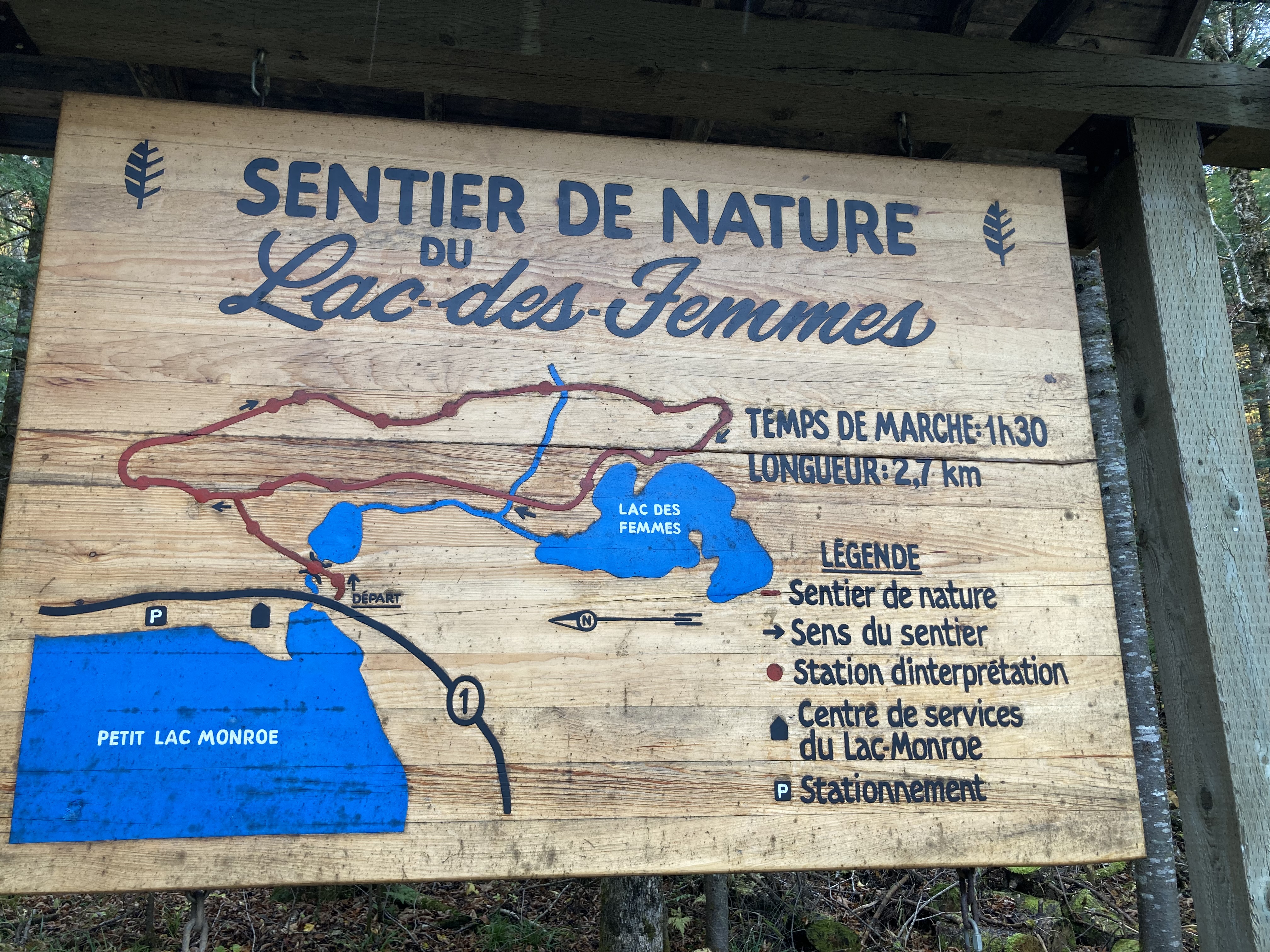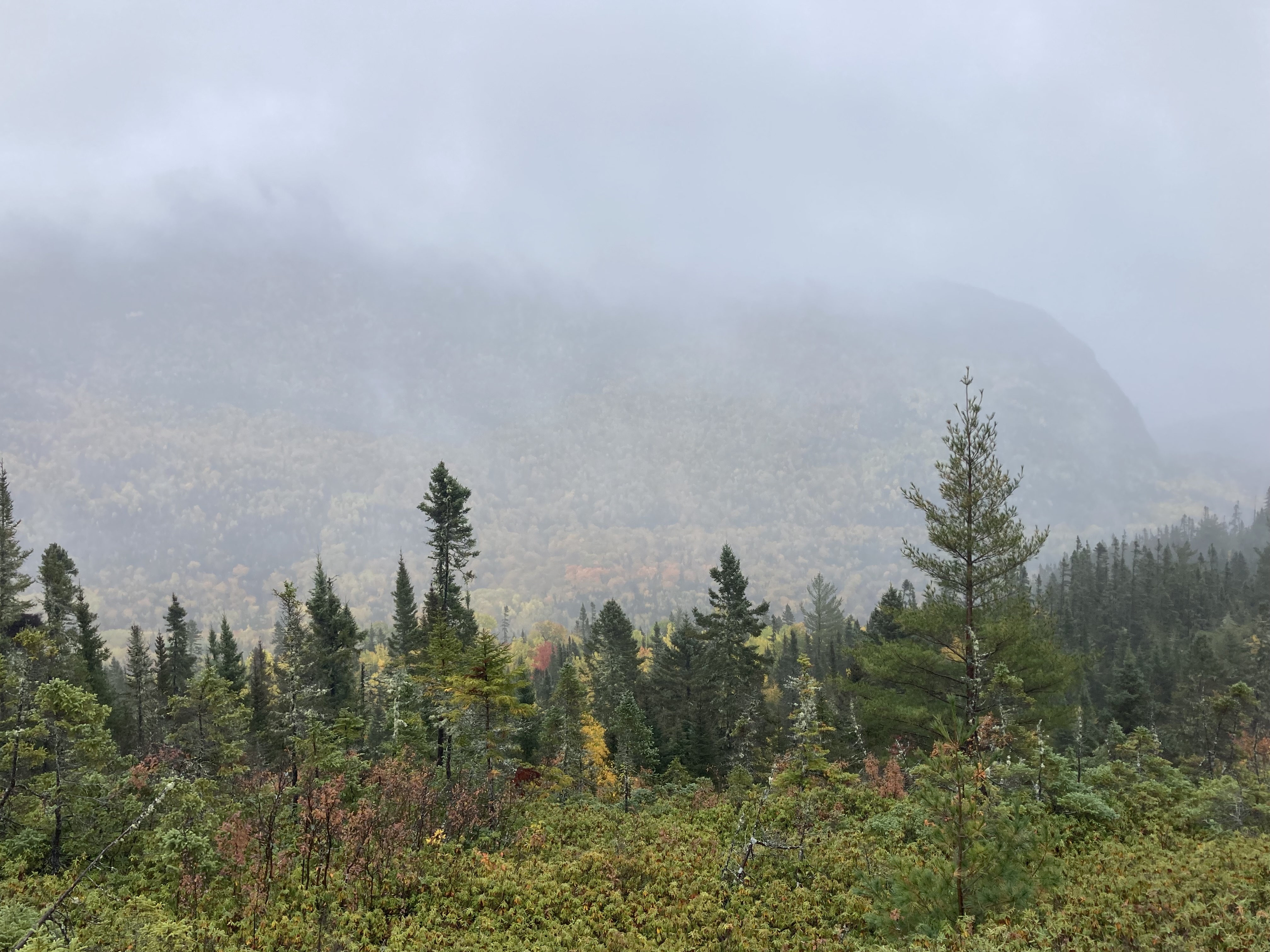Randonnée Mont Ernest-Laforce : 4,6 km – 155 mètres de dénivelé – annoncée pour 2 heures, nous avons mis 1h30. Randonnée annoncée comme le meilleur ratio effort versus paysages. Normalement son sommet offre une vue à 360° sur les montagnes. Malheureusement pour nous il y avait du brouillard à l’arrivée. La randonnée est très agréable et nous avons pu l’apprécier car nous avons eu seulement un peu de pluie fine durant la marche. Cette randonnée permet également parfois de voir des orignaux, mais nous n’en n’avons pas vu.