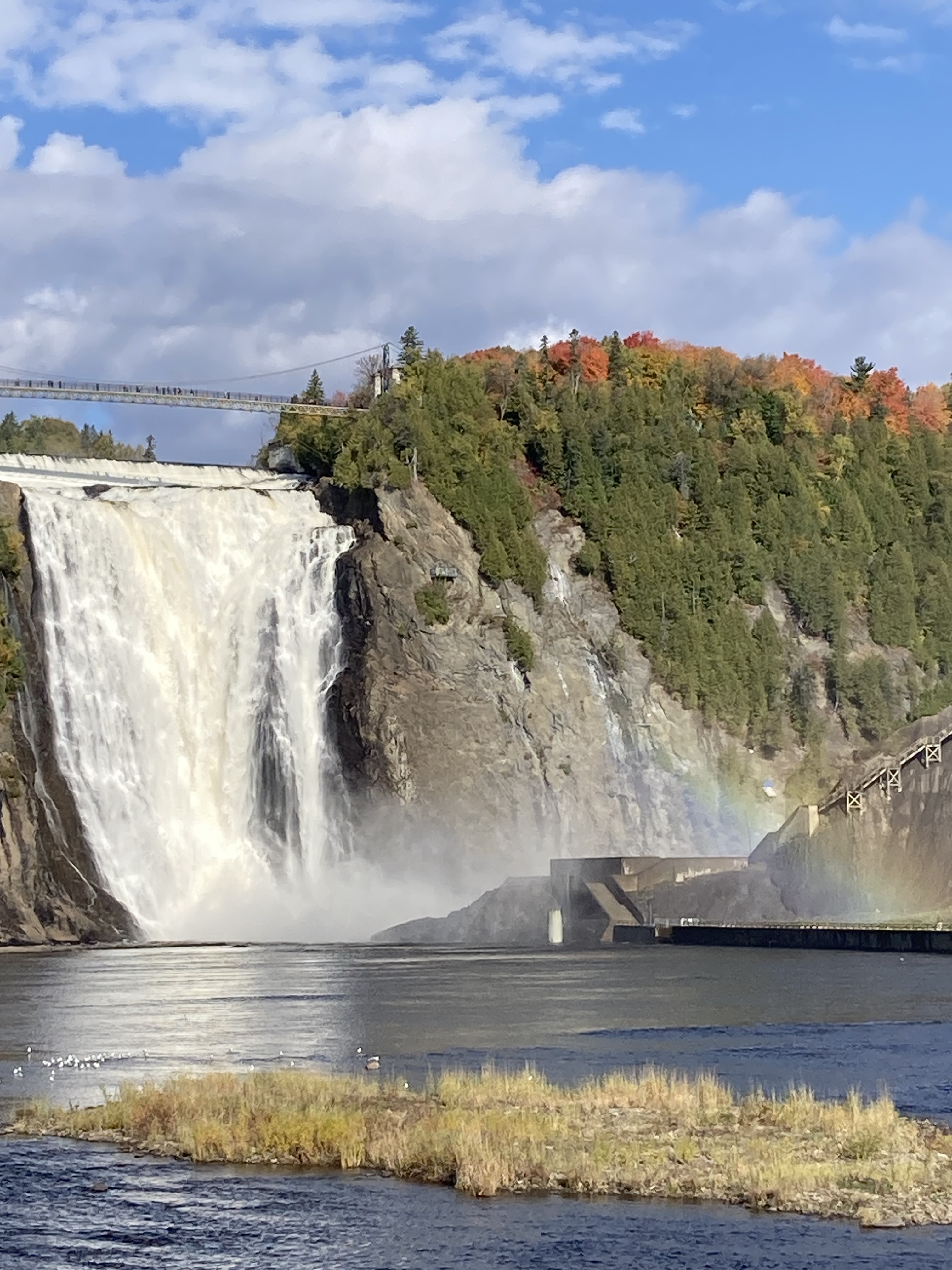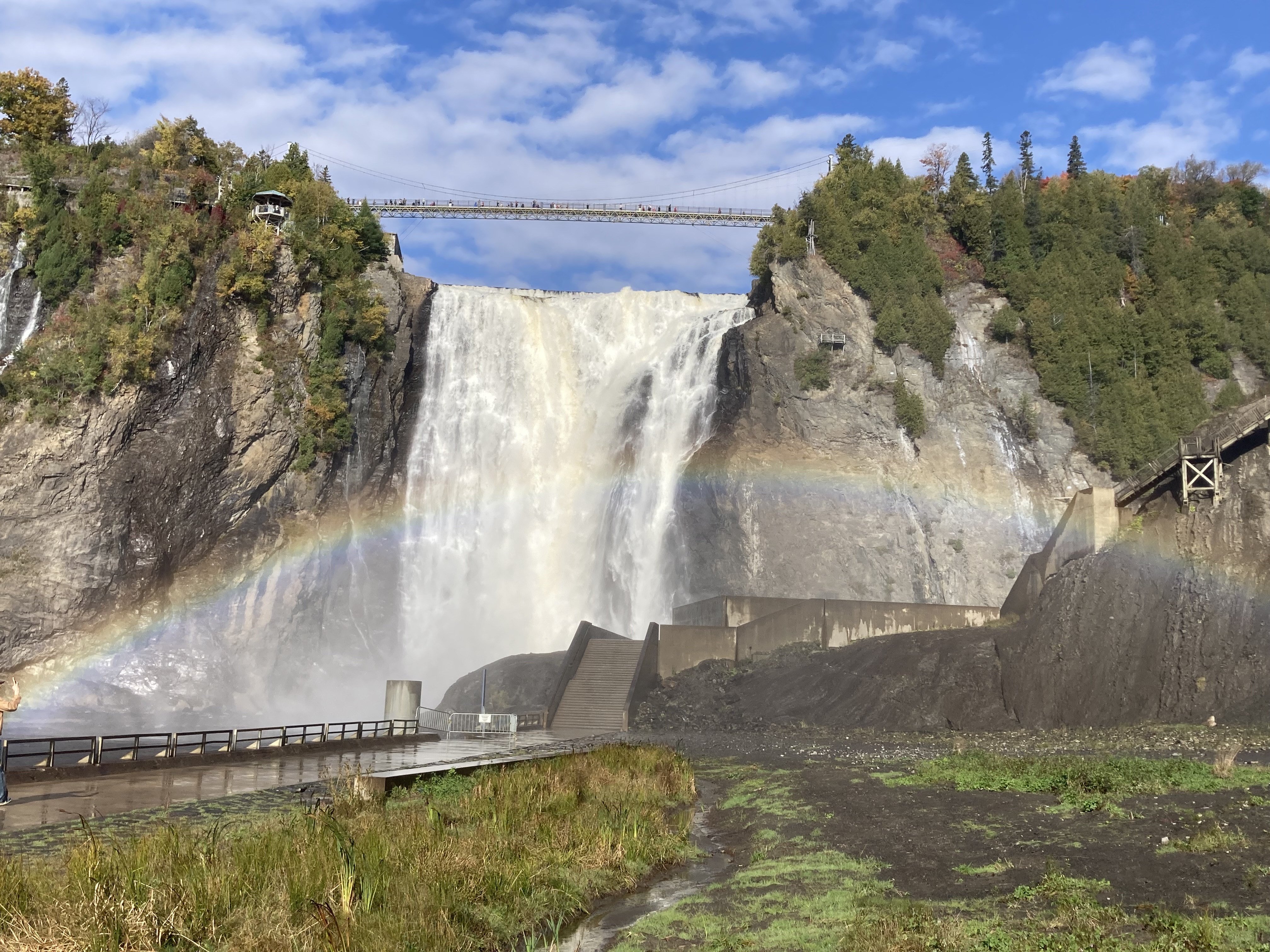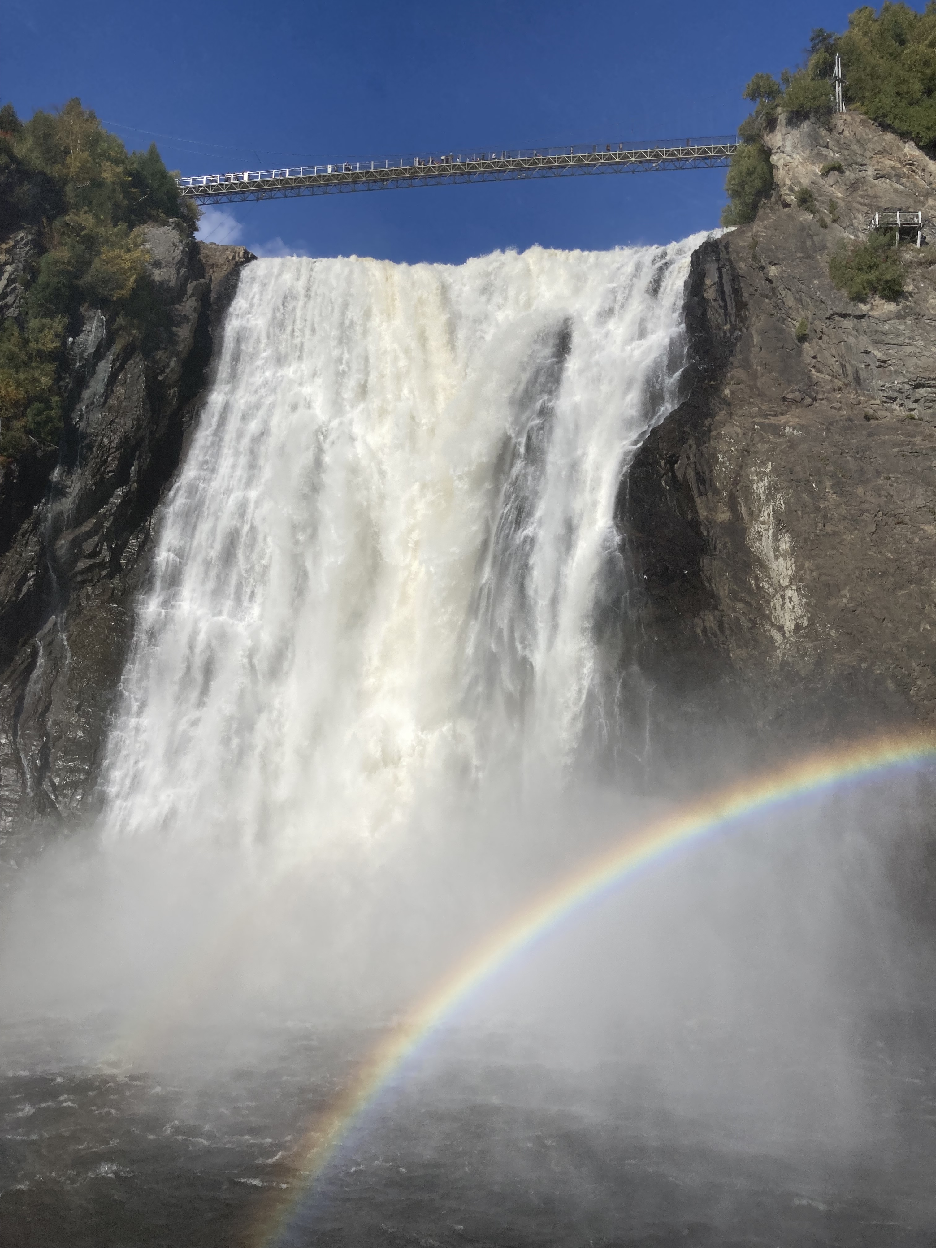 Ce matin, nous avons débuté avec la visite du Parc de la Chute Montmorency. Le parc est à environ 15 minutes du centre ville de Québec en voiture. C’est très facile d’accès. Nous avons décidé de monter par les marches et de ne pas prendre le funiculaire. Il y a plusieurs points de vue. Il faisait très beau et avec le soleil, il y avait un arc en ciel.