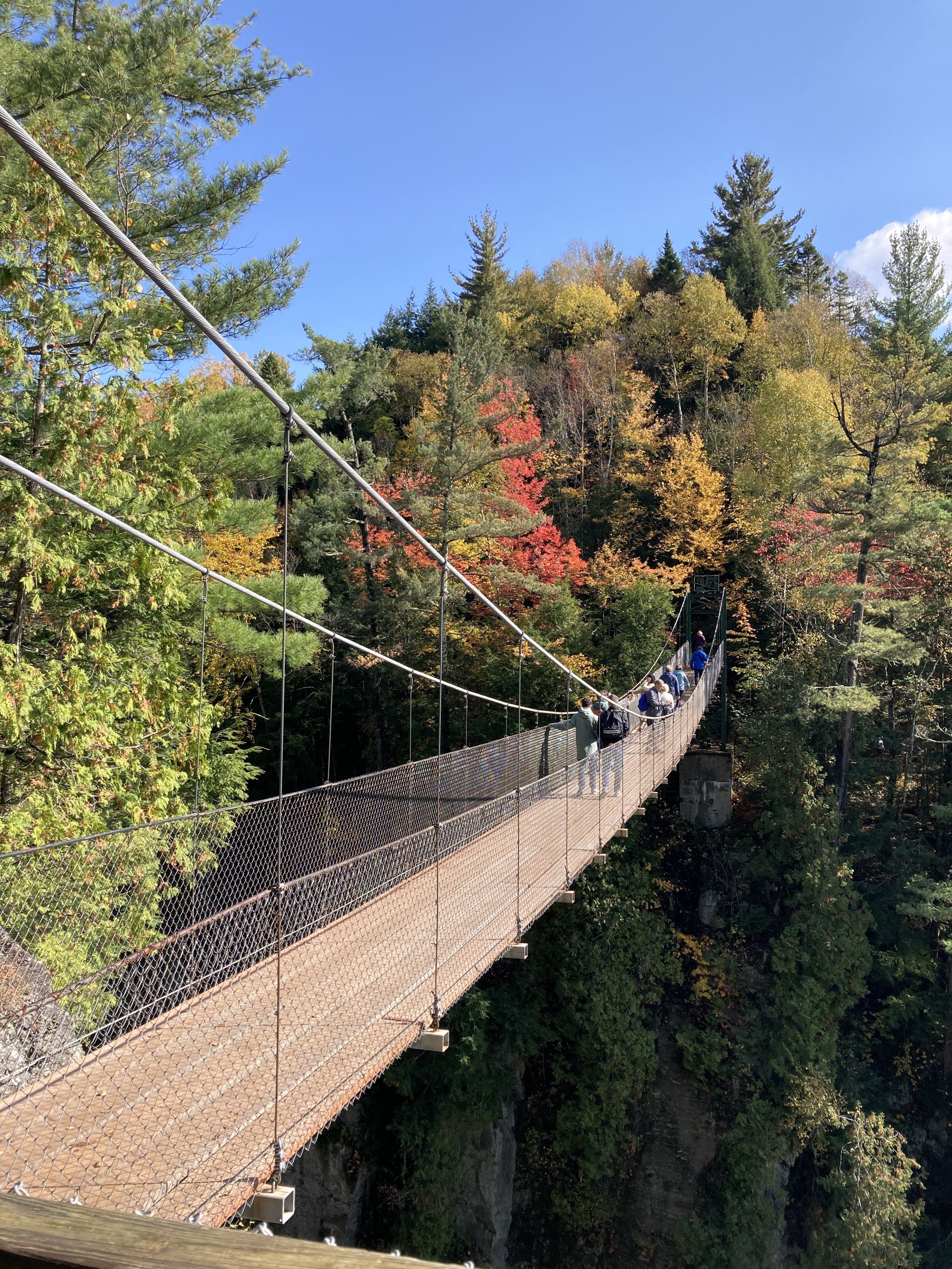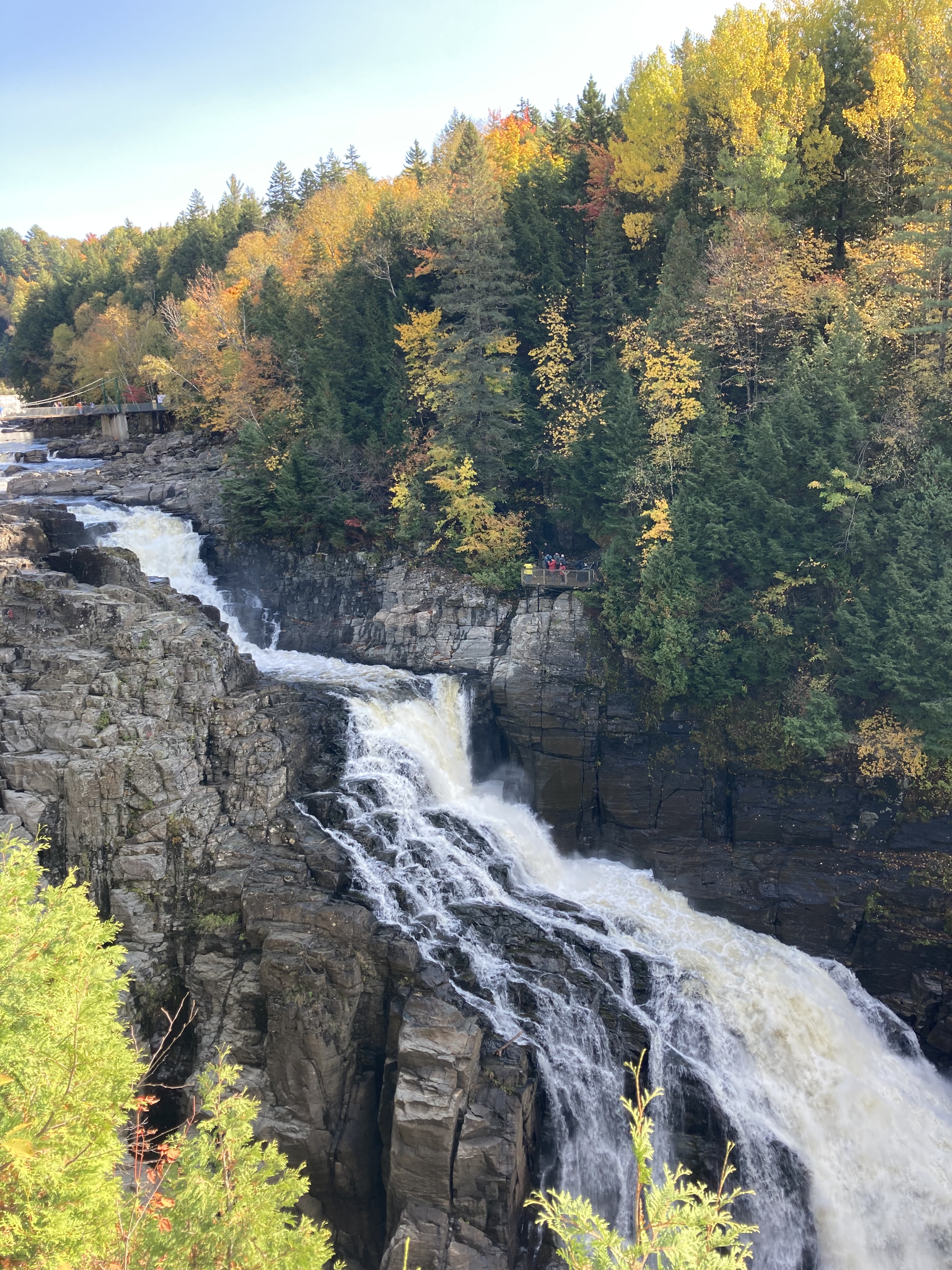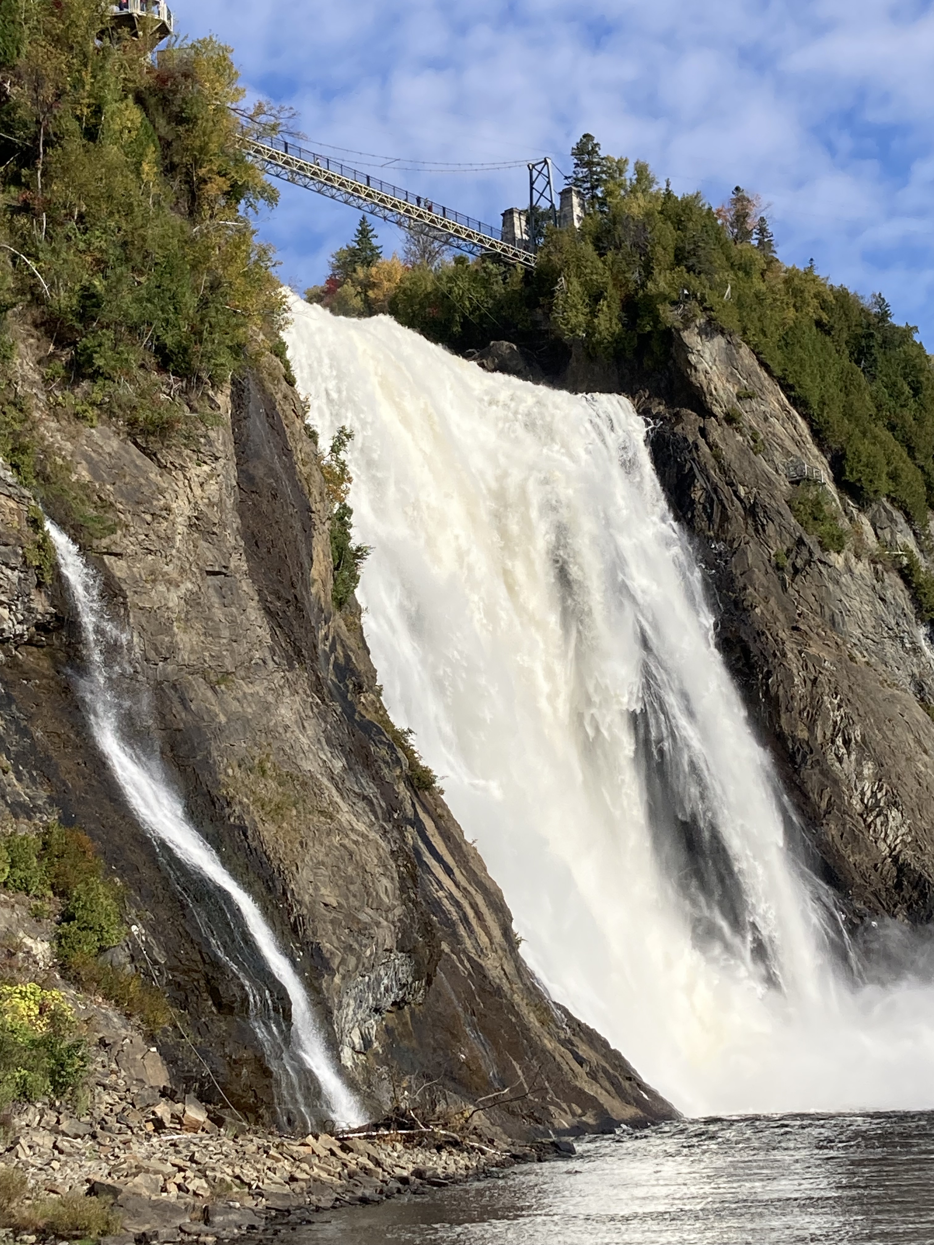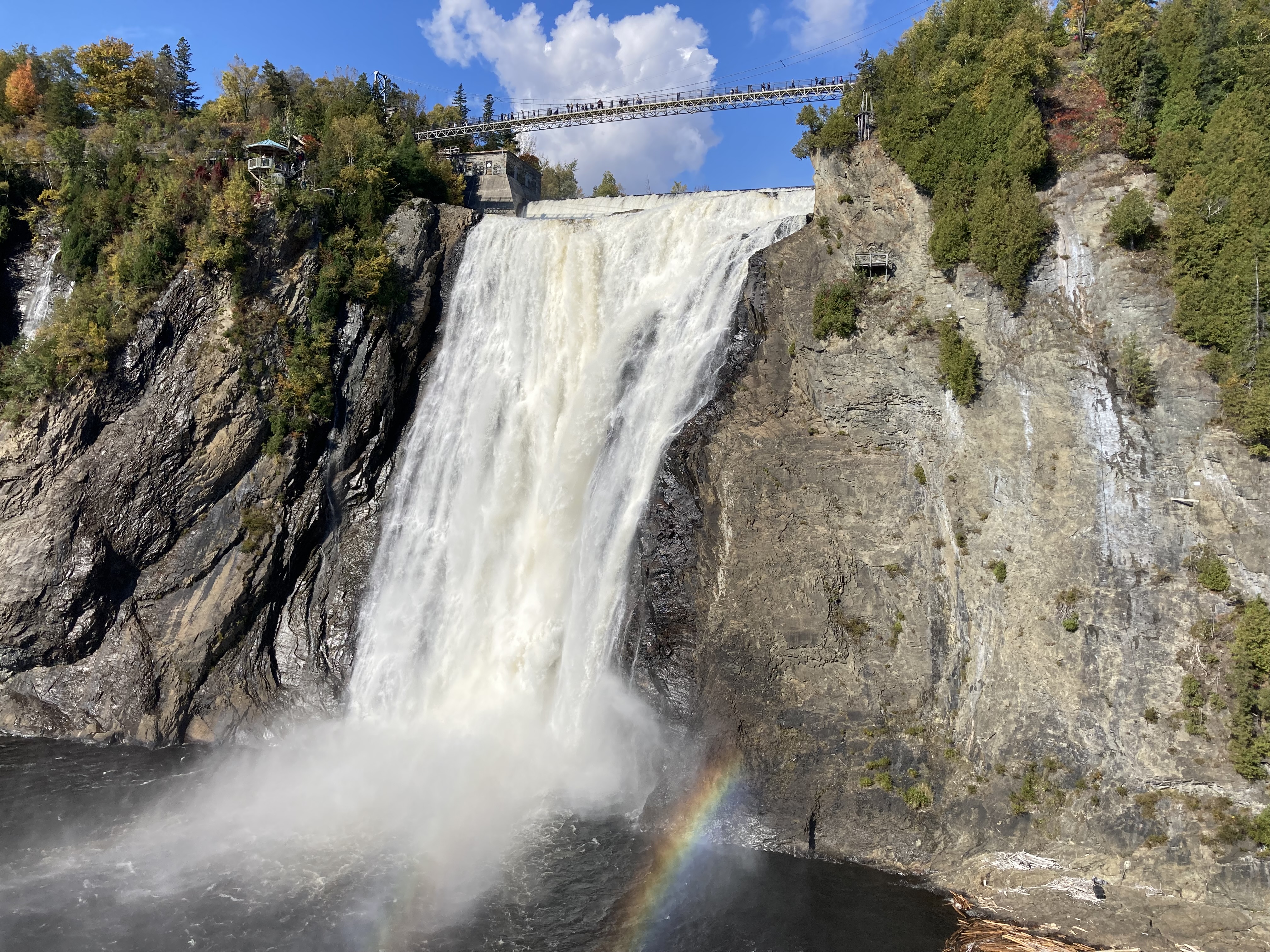 Ce matin, nous avons débuté avec la visite du Parc de la Chute Montmorency. Le parc est à environ 15 minutes du centre ville de Québec en voiture. C’est très facile d’accès. Nous avons décidé de monter par les marches et de ne pas prendre le funiculaire. Il y a plusieurs points de vue. Il faisait très beau et avec le soleil, il y avait un arc en ciel.