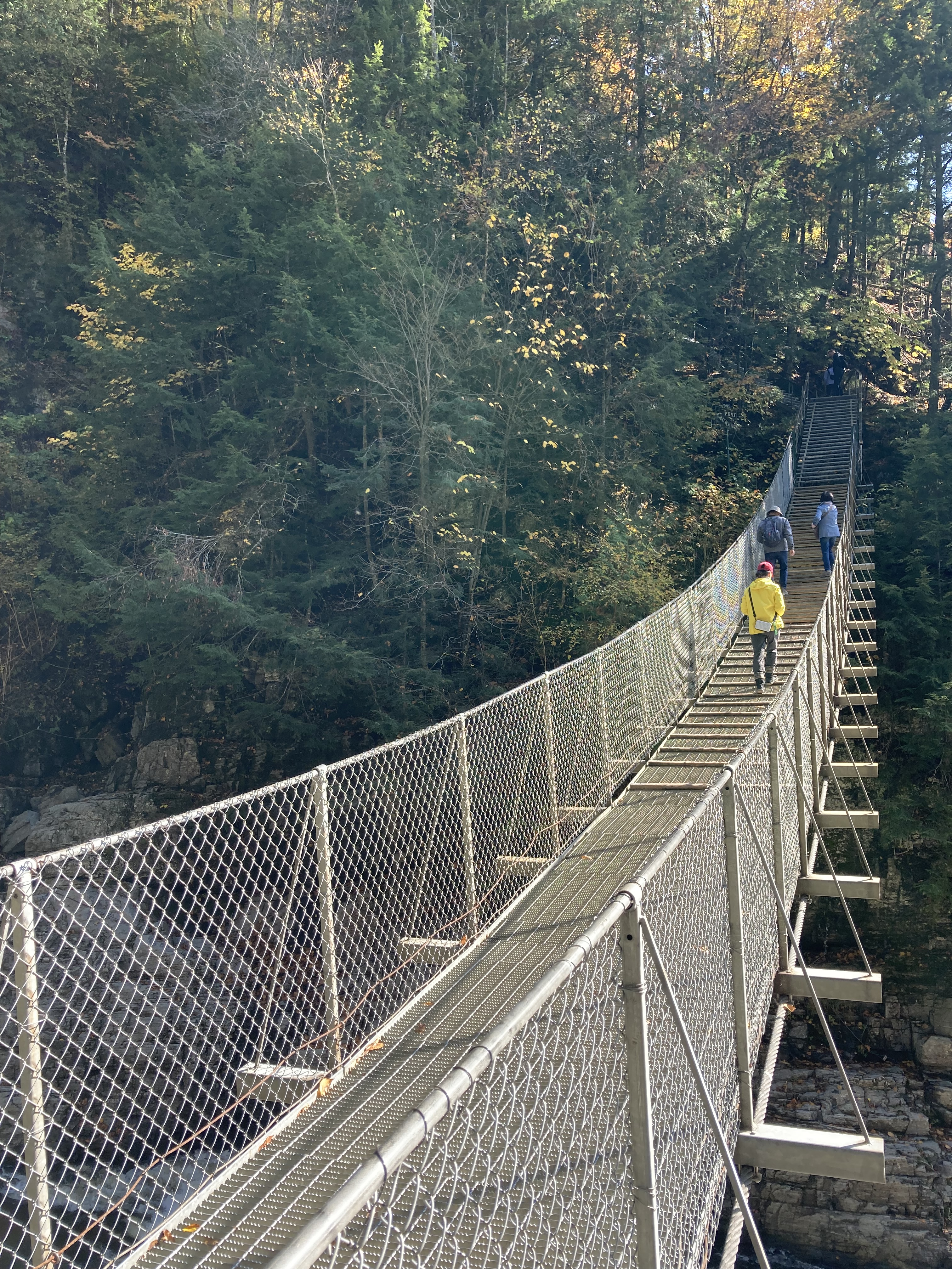Parc National des Hautes Gorges de la Rivière Malbai : nous devions faire la randonnée de l’Acropole des Draveurs qui devait nous prendre 5 heures. Malheureusement, comme hier, ce matin le temps est pluvieux avec beaucoup de brouillard donc pas grand intérêt de monter 800 m de dénivelé pour ne rien voir l’arrivée. Nous nous sommes rabattus sur la randonnée du Sentier le Riverain. Nous sommes partis du Pont des Érables et sommes montés jusqu’au point de vue du Yéti. En tout, un peu plus de 9 km et 270 mètres de dénivelé environ.