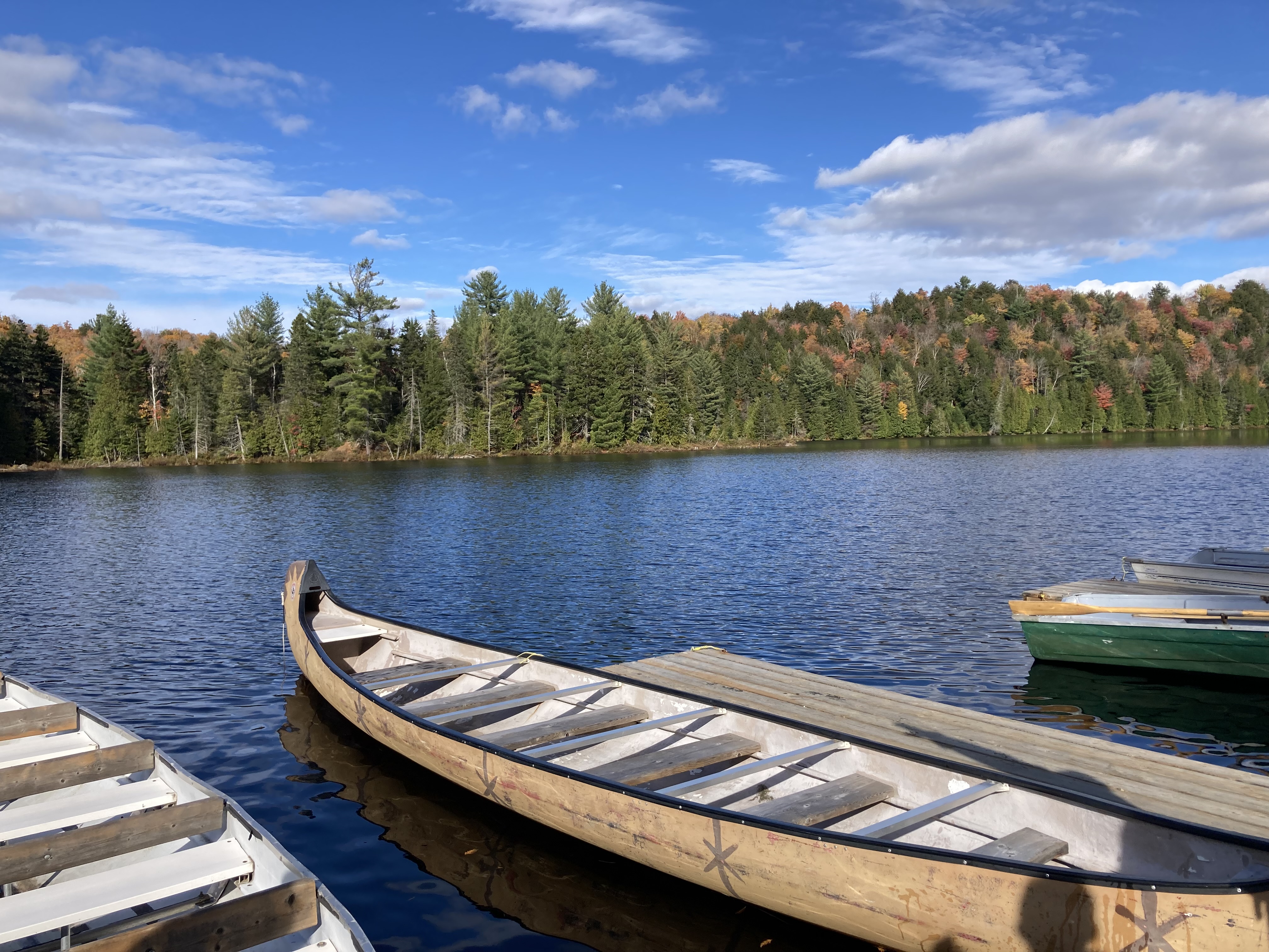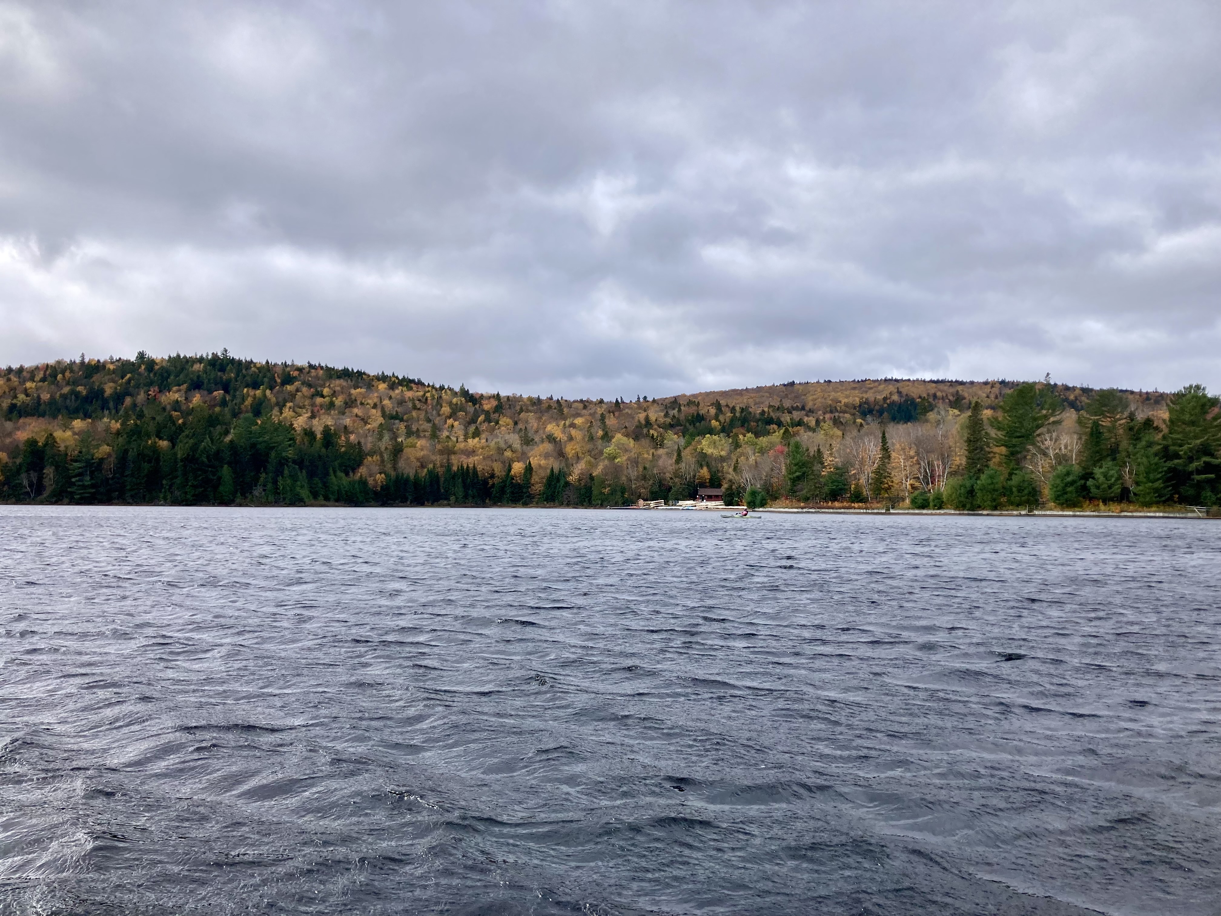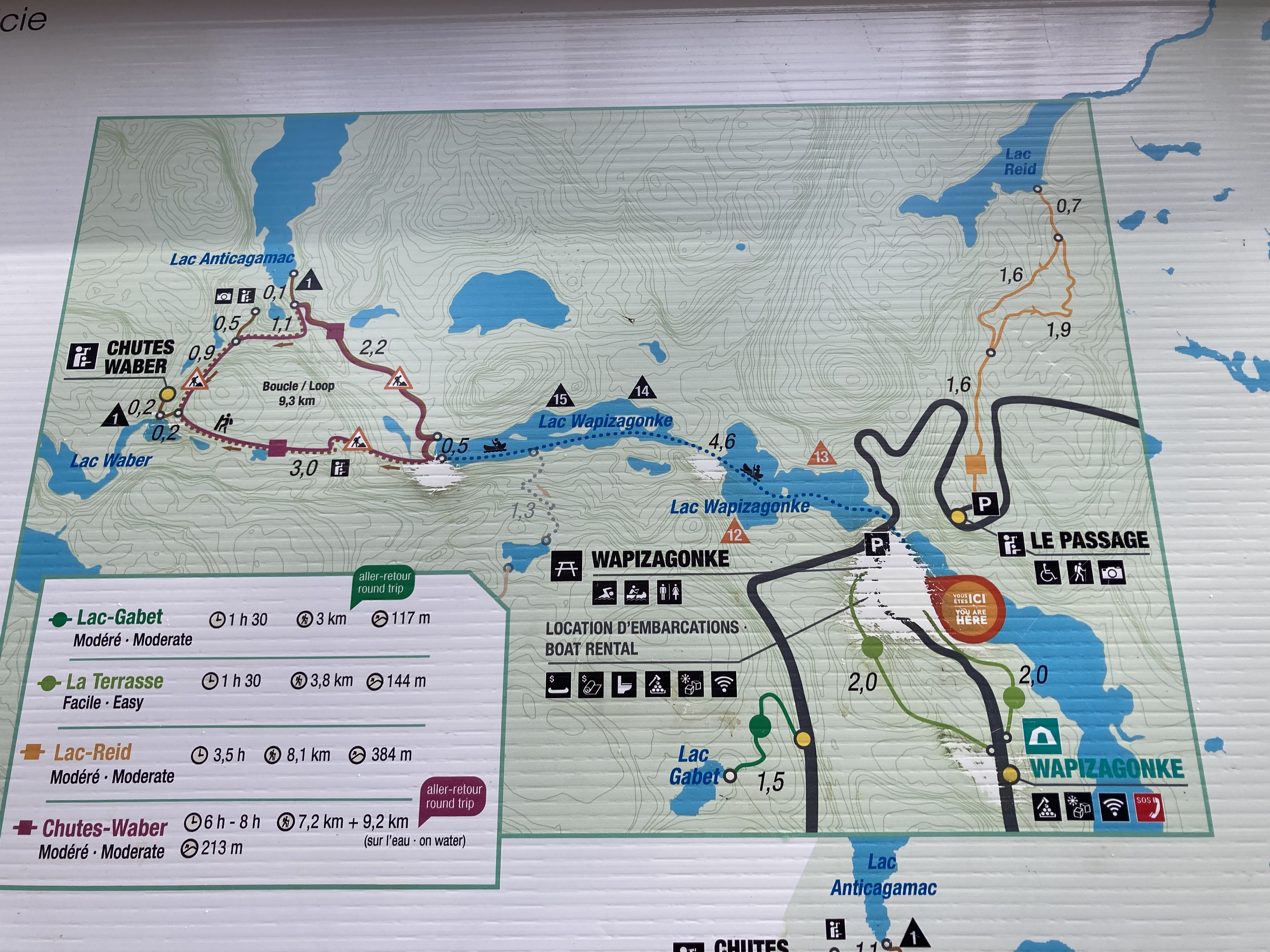 Découverte du Parc National de la Mauricie. Nous devions réaliser la balade en canot + randonnée aux chutes Waber. Nous sommes donc rendus au loueur de canot situé au Lac Wapizagonke. Il faisait beaucoup de vent. Nous avons pris le départ mais très rapidement après le premier pont, le vent était trop fort, il nous a été impossible d’arriver à avancer. Nous avons donc rebrousser chemin.