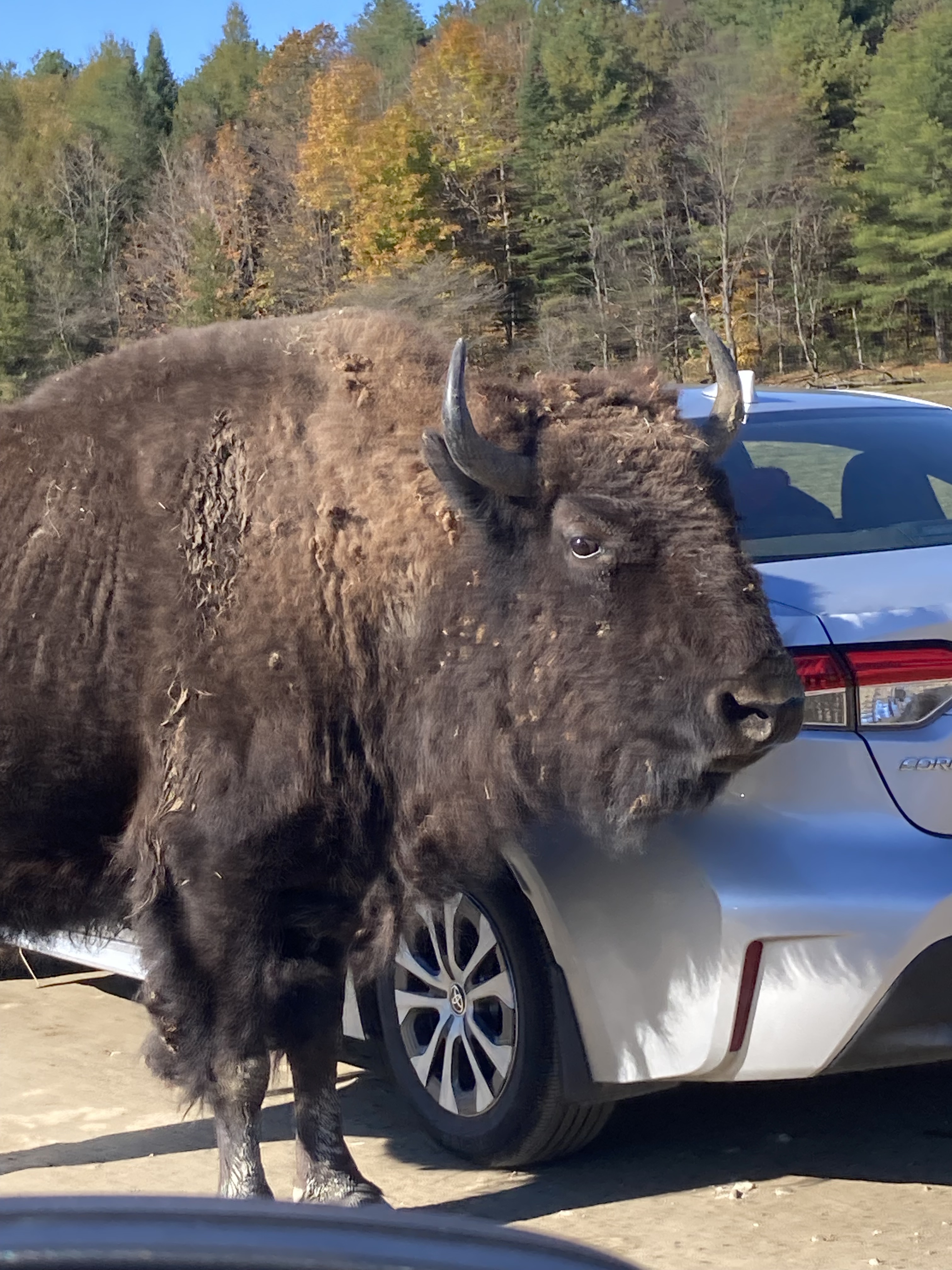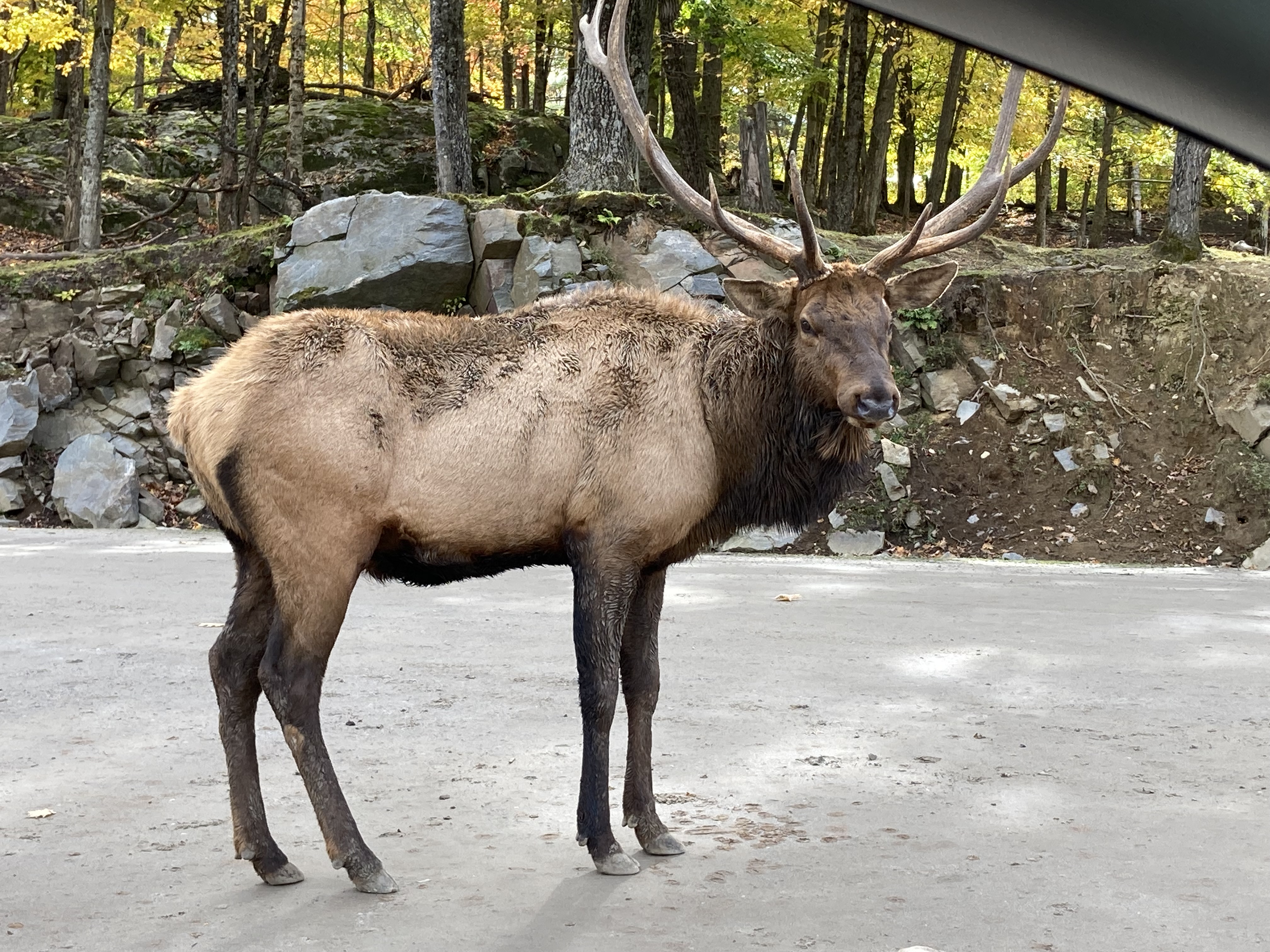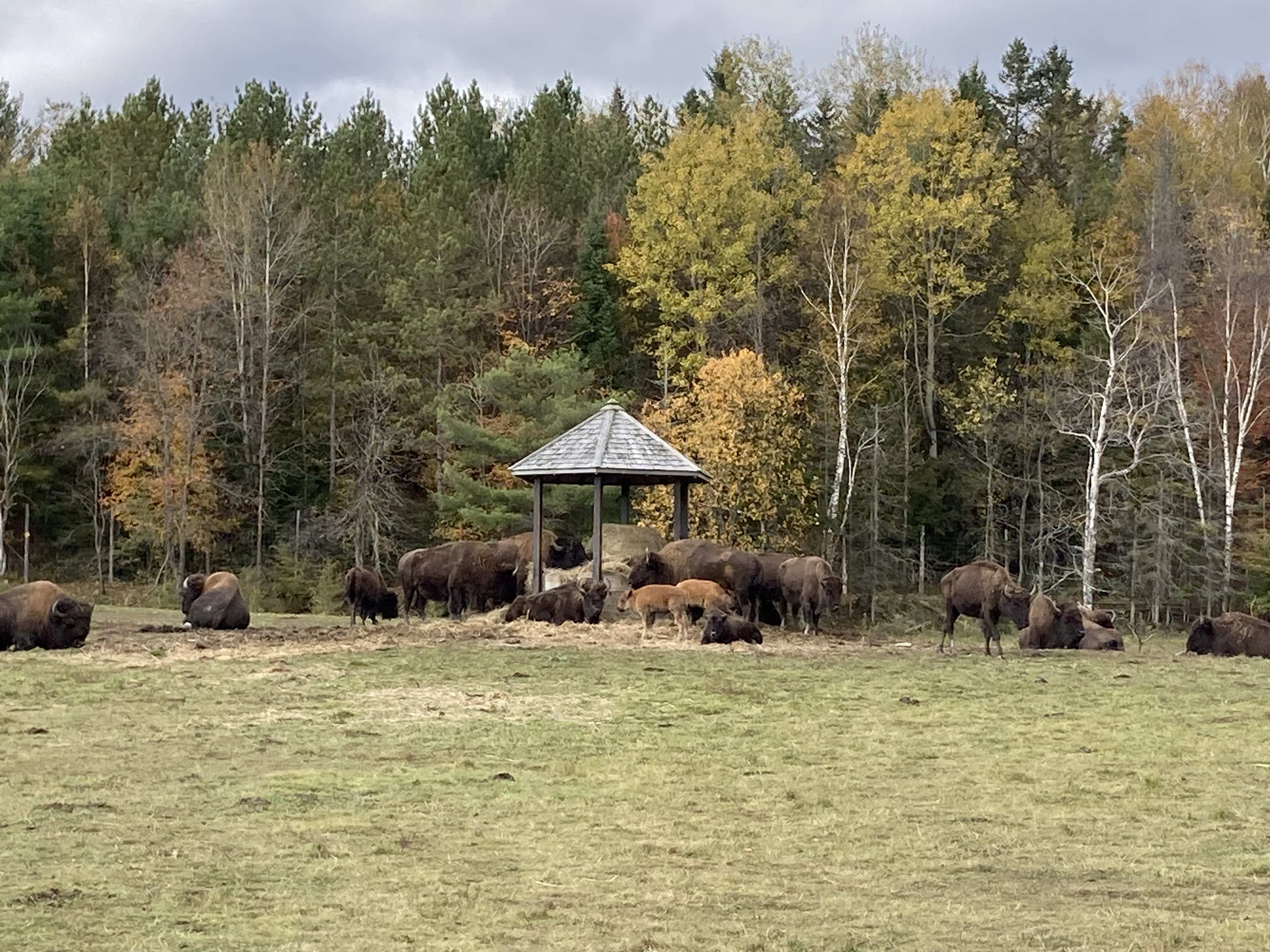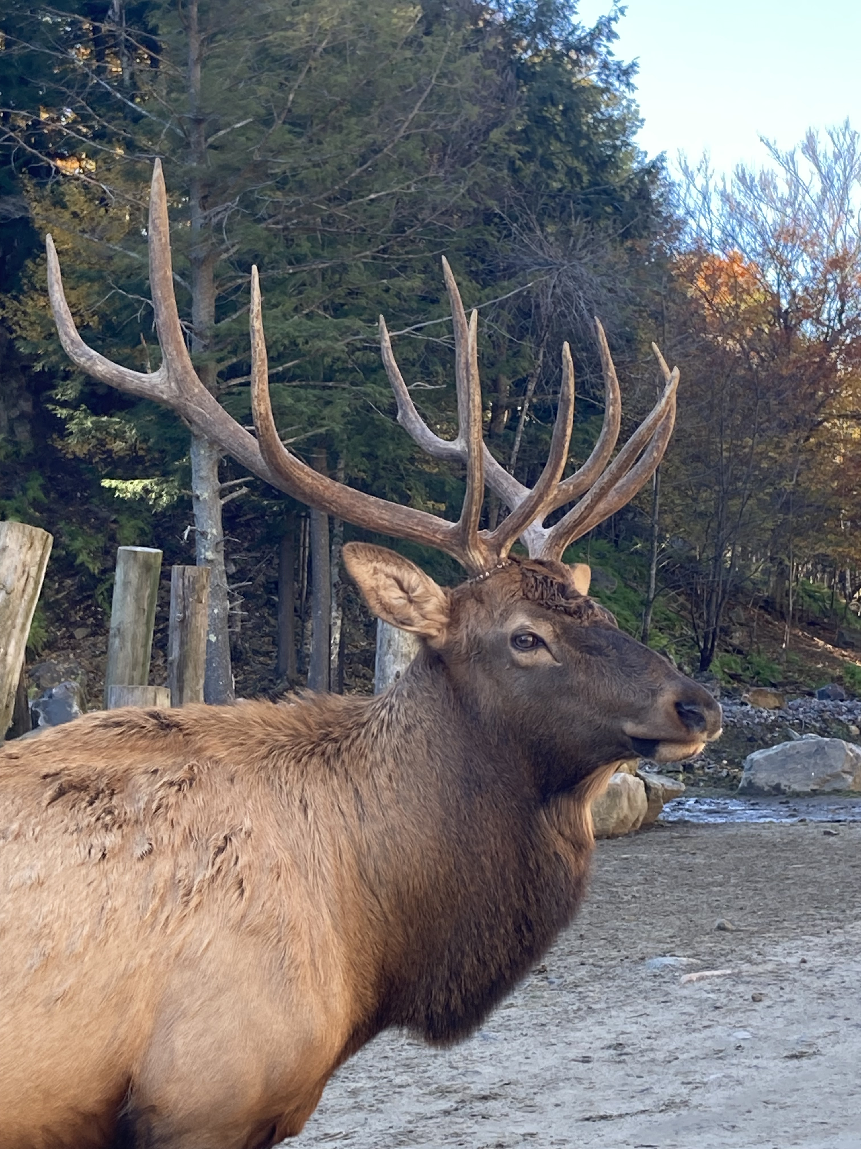 Nous sommes arrivés en fin de matinée au Parc Omega. Nous avions réservé un forfait gourmand : nuit en lodge des loups, petit déjeuner, dîner et deux jours d accès au parc. En tout nous aurons fait deux tours le premier jour et deux autres tours le lendemain. Les animaux ont de l’espace et du coup d’un tour sur l’autre on ne voit pas les mêmes animaux.